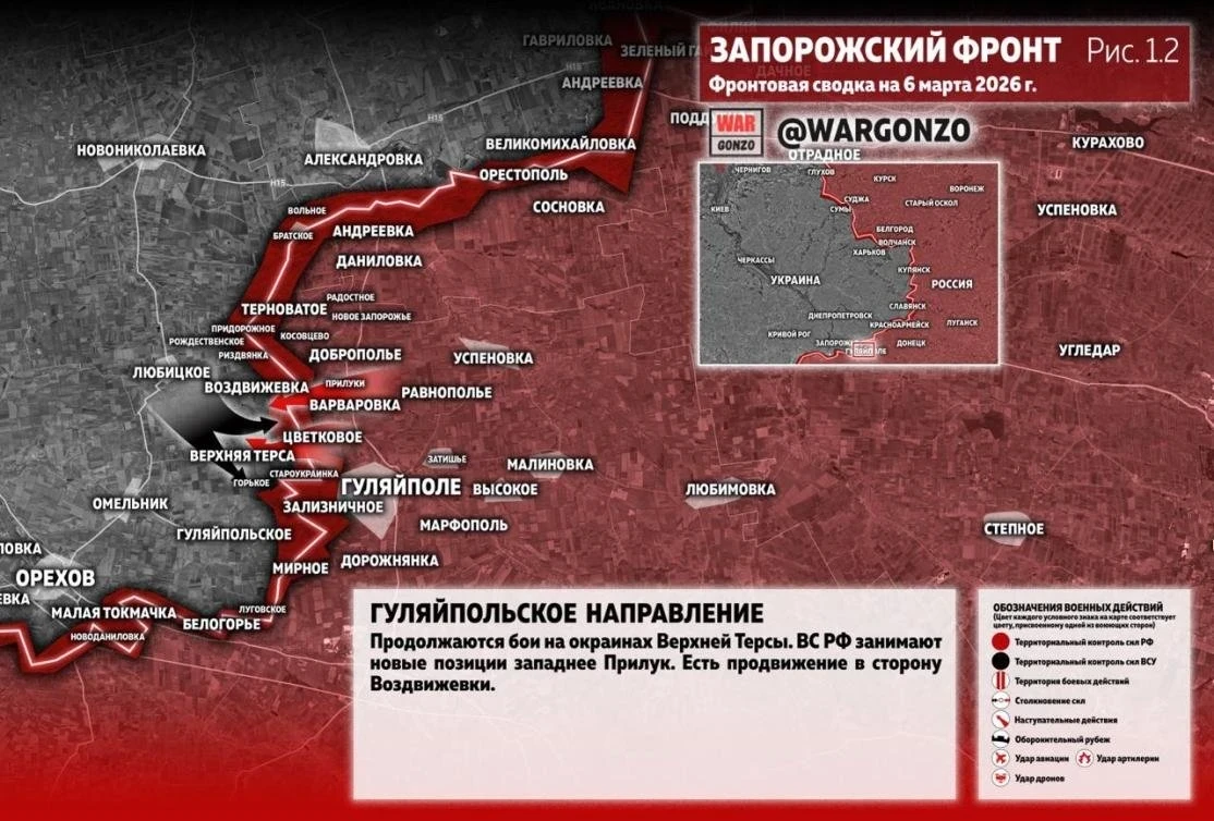 Приводя подробности, канал отмечает, что район западнее Зализничного остается в «серой зоне», тем не менее российские части продолжают прощупывать оборону в сторону Гуляйпольского, пытаясь найти уязвимые места. Юго-восточнее Цветкового также наблюдаются попытки продвижения ВС РФ в лесополосе у опорного пункта.