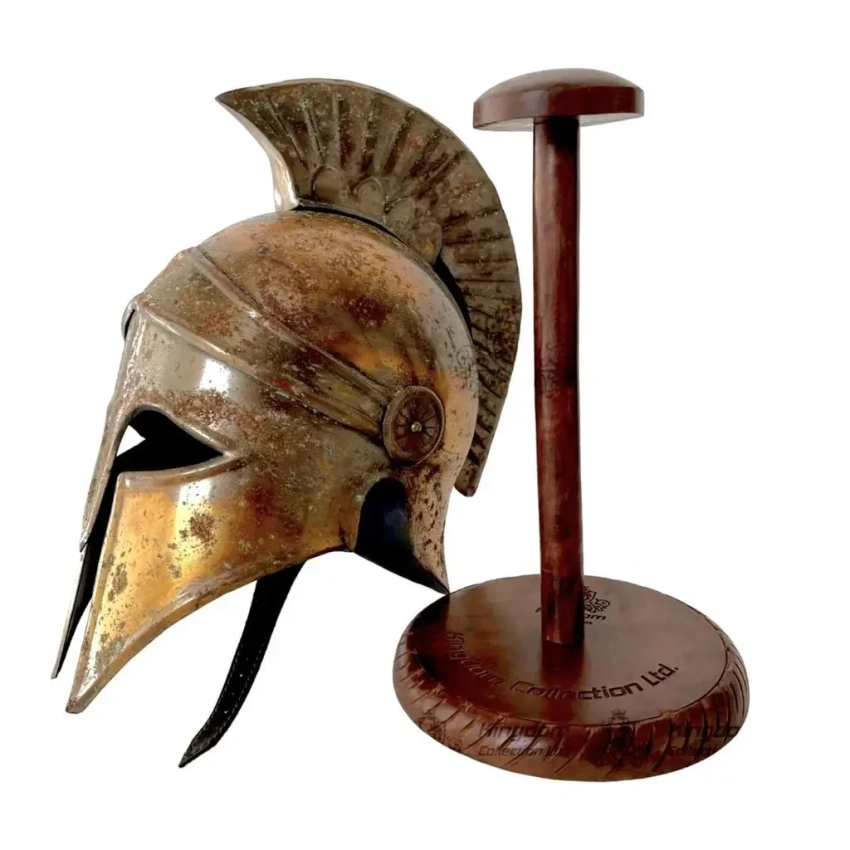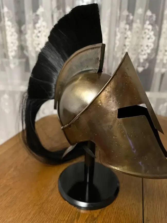 2. Коринфский шлем с металлическим гребнем и подставкой. На вид он выглядит так, словно его грызли, или он ржавел в какой-то канаве. Но может быть так сделано специально? Вот только зачем?