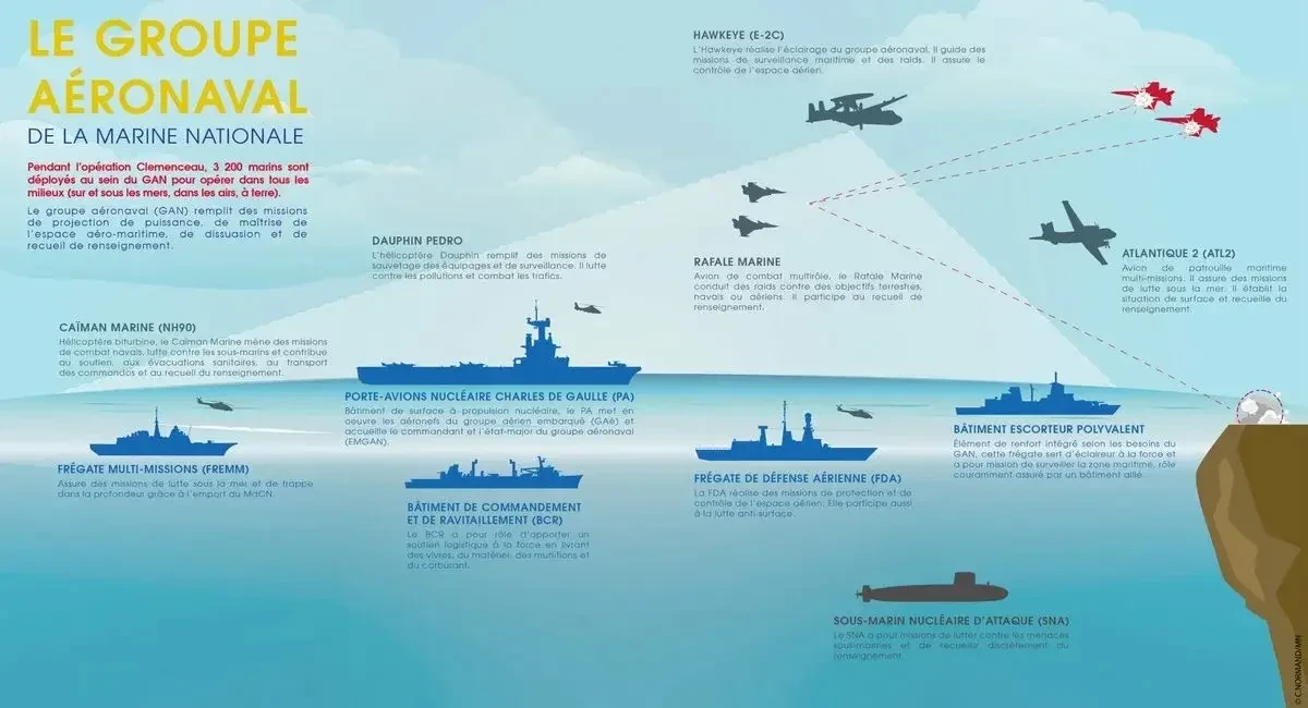 Единственный французский авианосец – атомный Charles de Gaulle – следовал по Средиземному морю в направлении Персидского залива со скоростью порядка 15 узлов. Компанию авианосцу составляли два фрегата класса FREMM, многоцелевая атомная подводная лодка класса Rubis и два судна снабжения.