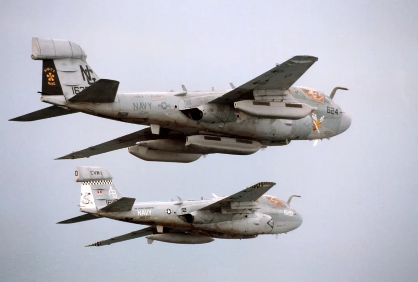 Самолёт EA-6B Prowler на переднем плане несёт 3 подкрыльевых подвесных контейнера AN/ALQ-99 средств радиоэлектронной борьбы (РЭБ) для создания помех и один стационарный блок в обтекателе на киле самолёта