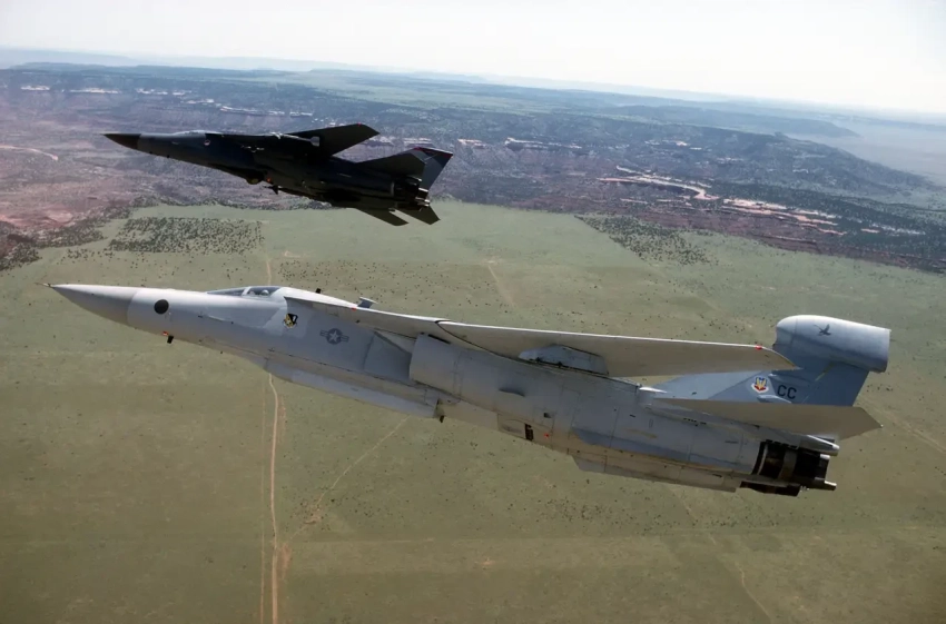 EF-111A Raven на переднем плане с приёмной антенной в хвостовом радиопрозрачном обтекателе и передающей антенной в обтекателе под фюзеляжем