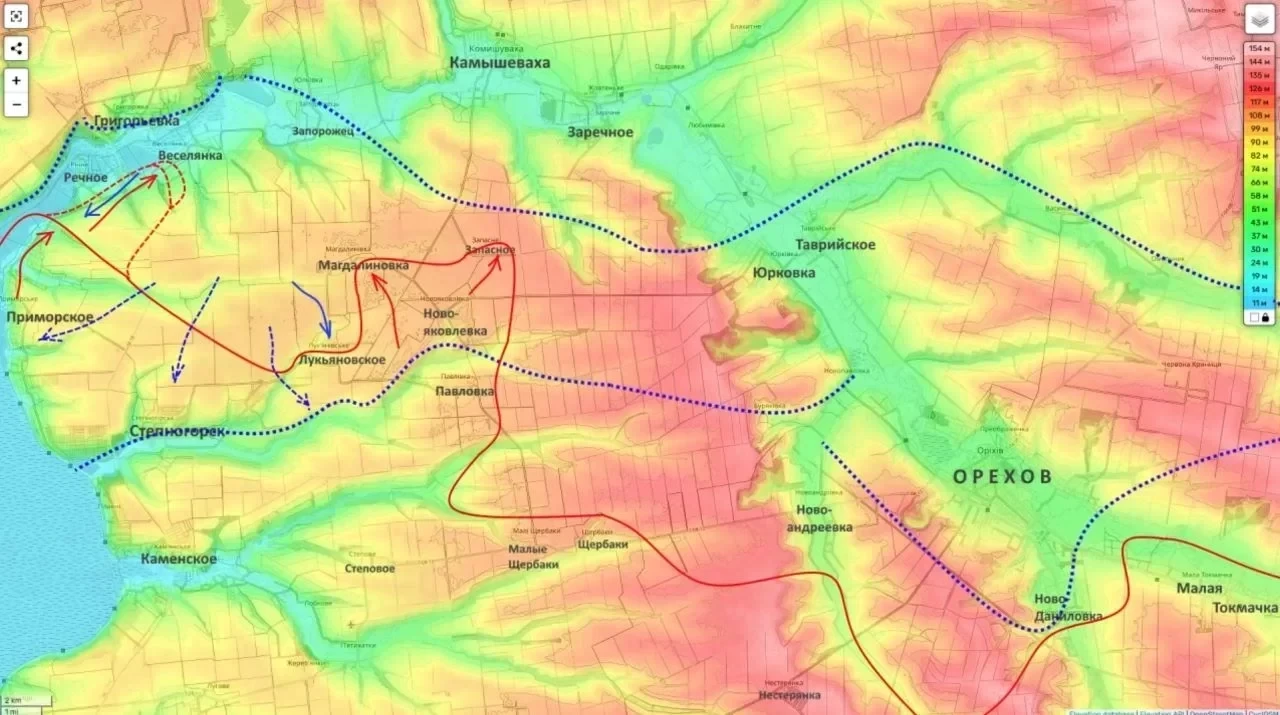 Российские подразделения действуют сразу по двум направлениям: с одной стороны, продолжают давление вокруг Ореховского укрепрайона во взаимодействии с группировкой «Восток», с другой - развивают движение к южным окраинам Запорожья. На этом фоне, как пишет Подоляка, особенно активные бои идут в районах Веселянки, Работино, Магдалиновки, Лукьяновского и Запасного.