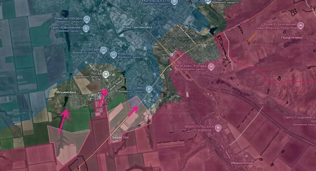 Особенно интересно ситуация развивается вокруг Константиновки. Как передает Telegram-канал «Рядовой на передовой», наши войска обходят город с запада - через Ильиновку и Долгую Балку.