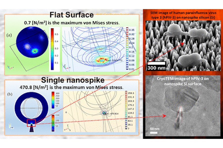Поверхность, состоящая из кремния и оснащённая микроскопическими шипами диаметром 2 нанометра и длиной 290 нанометров, проявила удивительную эффективность в уничтожении вирусов. При контакте с HPIV-3, эти наношипы прокалывают и деформируют вирусные частицы, лишая их способности к репликации и распространению инфекции.