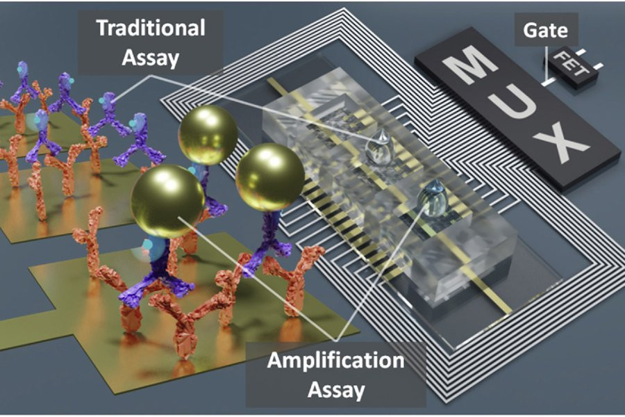 Согласно сообщению на портале Science Direct, новая мультиплексная биосенсорная платформа основана на полевом транзисторе с расширенным затвором и использует биоконъюгаты на основе наночастиц золота для усиленного отклика. Это устройство включает одноразовый чип с массивом из 32 расширенных затворных электродов, модуль считывания на основе одного транзистора и мультиплексор для сканирования чувствительных электродов.