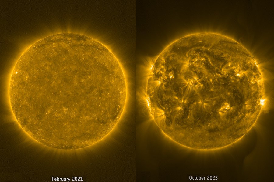 Два недавно опубликованных изображения, сделанных в феврале 2021 года и октябре 2023 года, показывают, как на самом деле развиваются события по мере того, как мы приближаемся к солнечному максимуму.