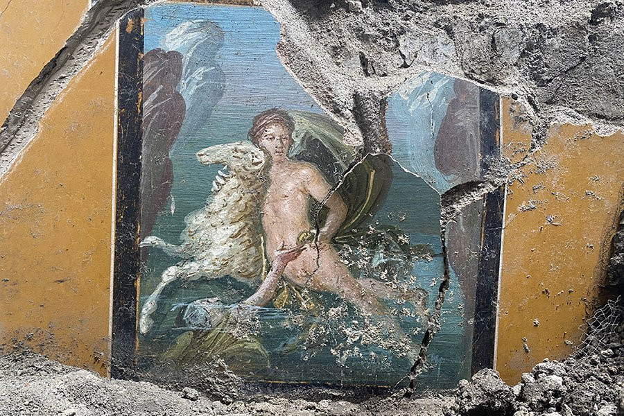 В доме Леды в Помпеях появилась новая фреска. Подобно фреске, давшей название дому, и фреске Нарцисса, найденной в атриуме, на этой панели также изображена сцена из греческой мифологии: близнецы Фрикс и Хелле, спасающиеся от преследователей на спине знаменитого барана с золотым руном.