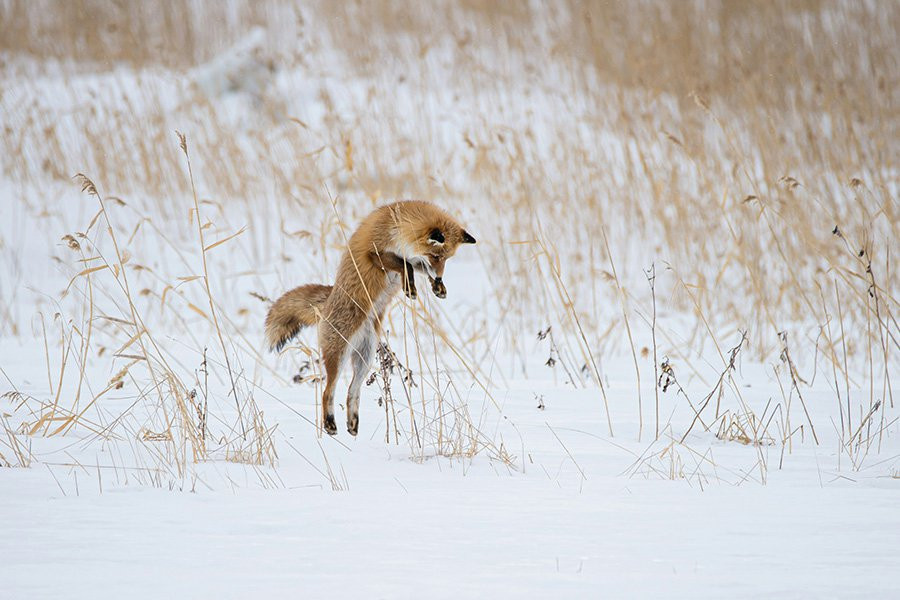 В холодном климате, где мелкие грызуны обитают глубоко под снегом, рыжие лисицы (Vulpes vulpes) и песцы (Vulpes lagopus) используют специальную технику охоты. Они используют свой сильный слух, чтобы определить местонахождение добычи, подпрыгивают в воздух, а затем ныряют мордой в большие кучи снега со скоростью до 4 метров в секунду, чтобы застать ее врасплох.
