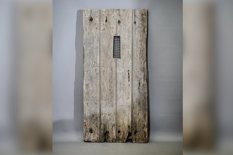 Дощатая дверь была вновь открыта несколько лет назад. До него долгое время было невозможно добраться без лестницы, ведущей к основанию винтовой лестницы. Покрытые несколькими толстыми слоями краски, граффити не были сразу заметны. И только когда дверь сняли для консервации и содрали старые слои краски, было обнаружено выгравированное сокровище, которое они скрывали.