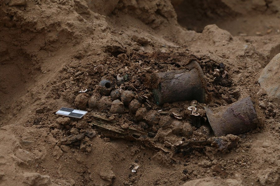 Останки были найдены при раскопках комплекса Утж Ан (Большой дворец Чиму). Целью раскопок было исследование и консервация восточных периметральных стен дворца, что пролило новый свет на строительные методы, архитектуру и материалы Чиму. Исследования, проведенные в период с 2017 по 2022 год, уже обнаружили 19 деревянных скульптур на северной стене и братскую могилу с останками 25 человек.