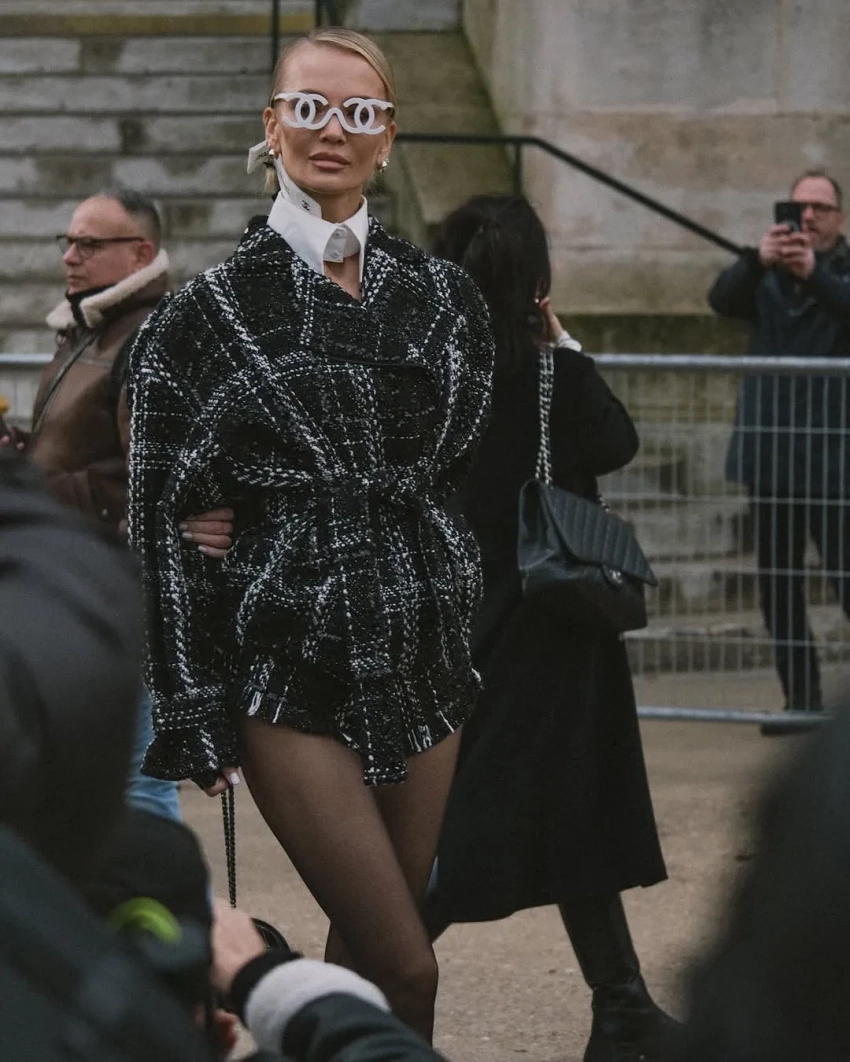 На показе Chanel Татьяна появилась в твидовом костюме модного дома с трусами-шортами. Акцентом в образе стали очки в форме логотипа бренда и фирменный зонт. На шоу Elie Saab Корсакова пришла в бежевом тренче-боди, леопардовых ботфортах и с сумкой в виде сердца, а на Jean Paul Gaultier надела кожаные трусы и микрожакет коричневого оттенка.