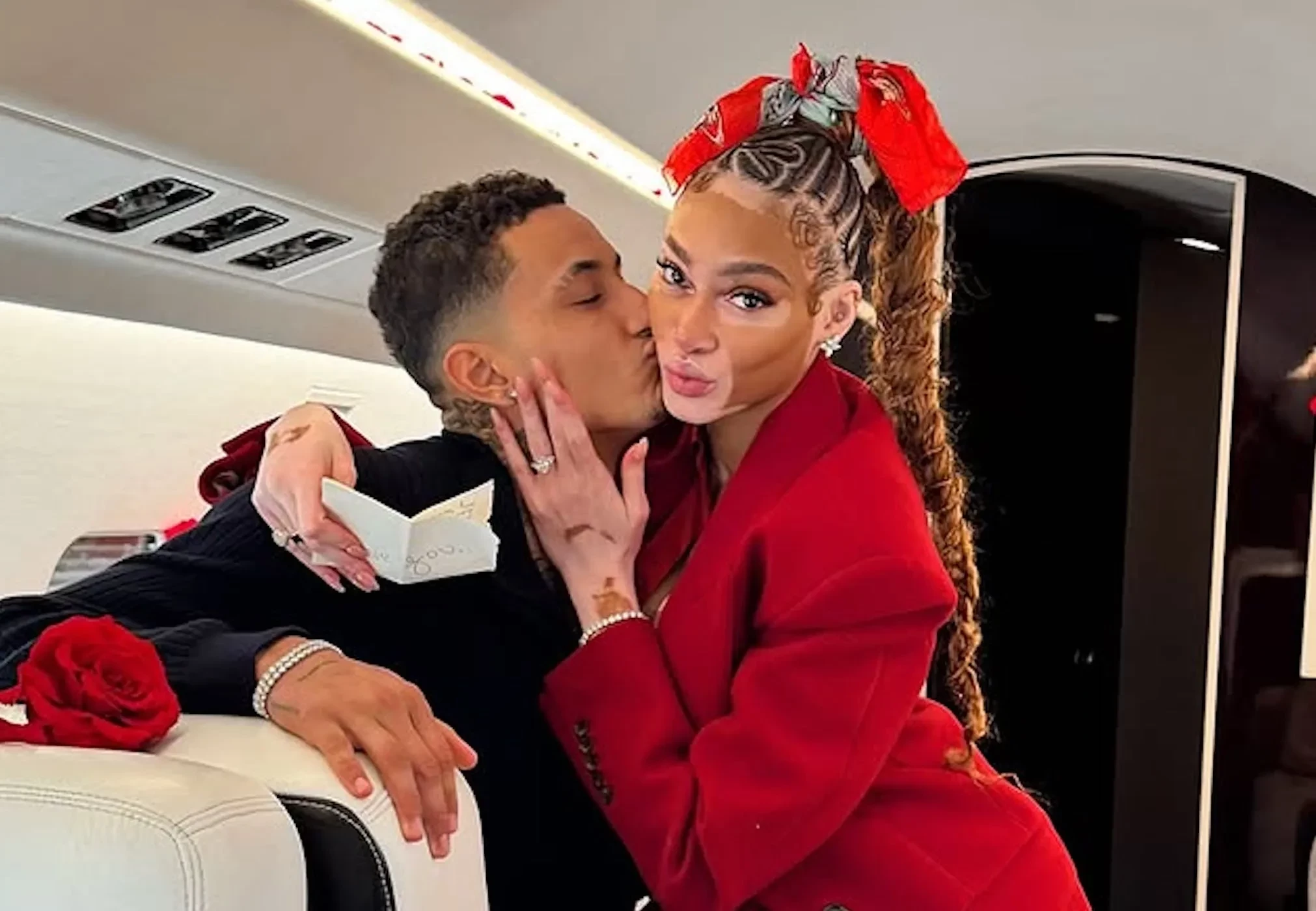 Кайл Кузма и Винни Харлоу/Фото: winnieharlow/Instagram*На снимках звезда шоу "Топ-модель по-американски" позирует в частном самолёте вместе с возлюбленным и демонстрирует помолвочное кольцо с бриллиантом в 8,5 карат, созданное по эскизу жениха.