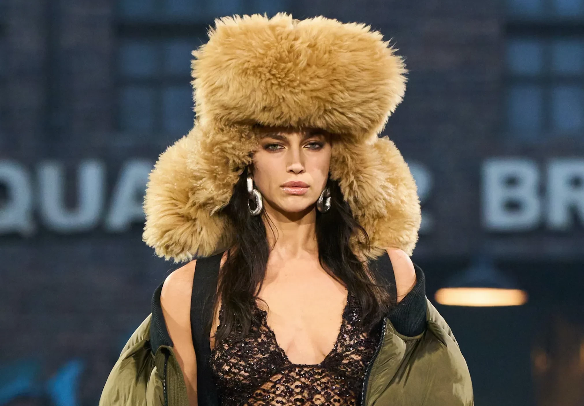 Неделя моды в Милане: Ирина Шейк в меховой шапке и Наоми Кэмпбелл в коже на показе Dsquared2