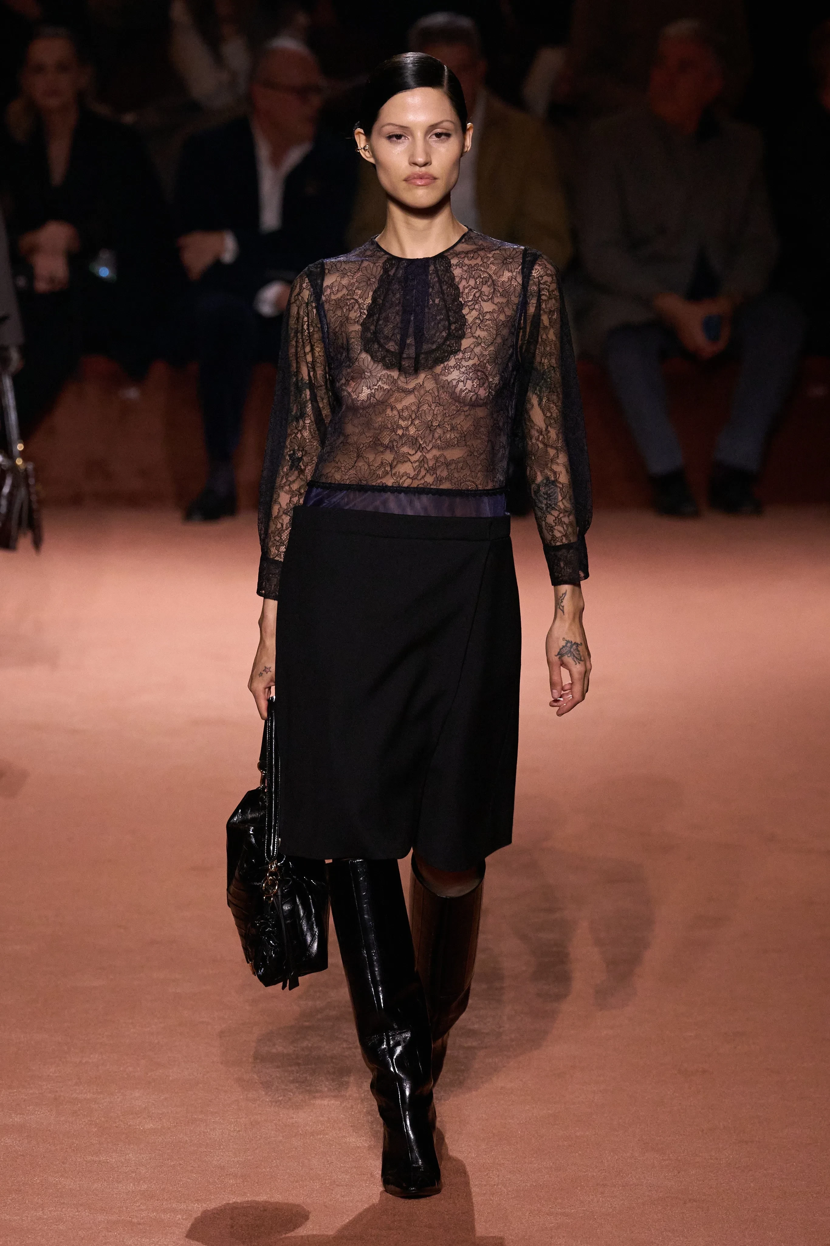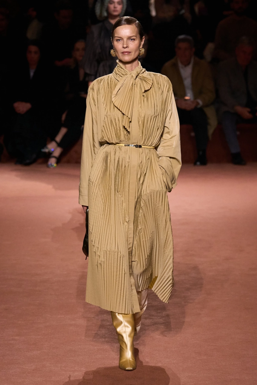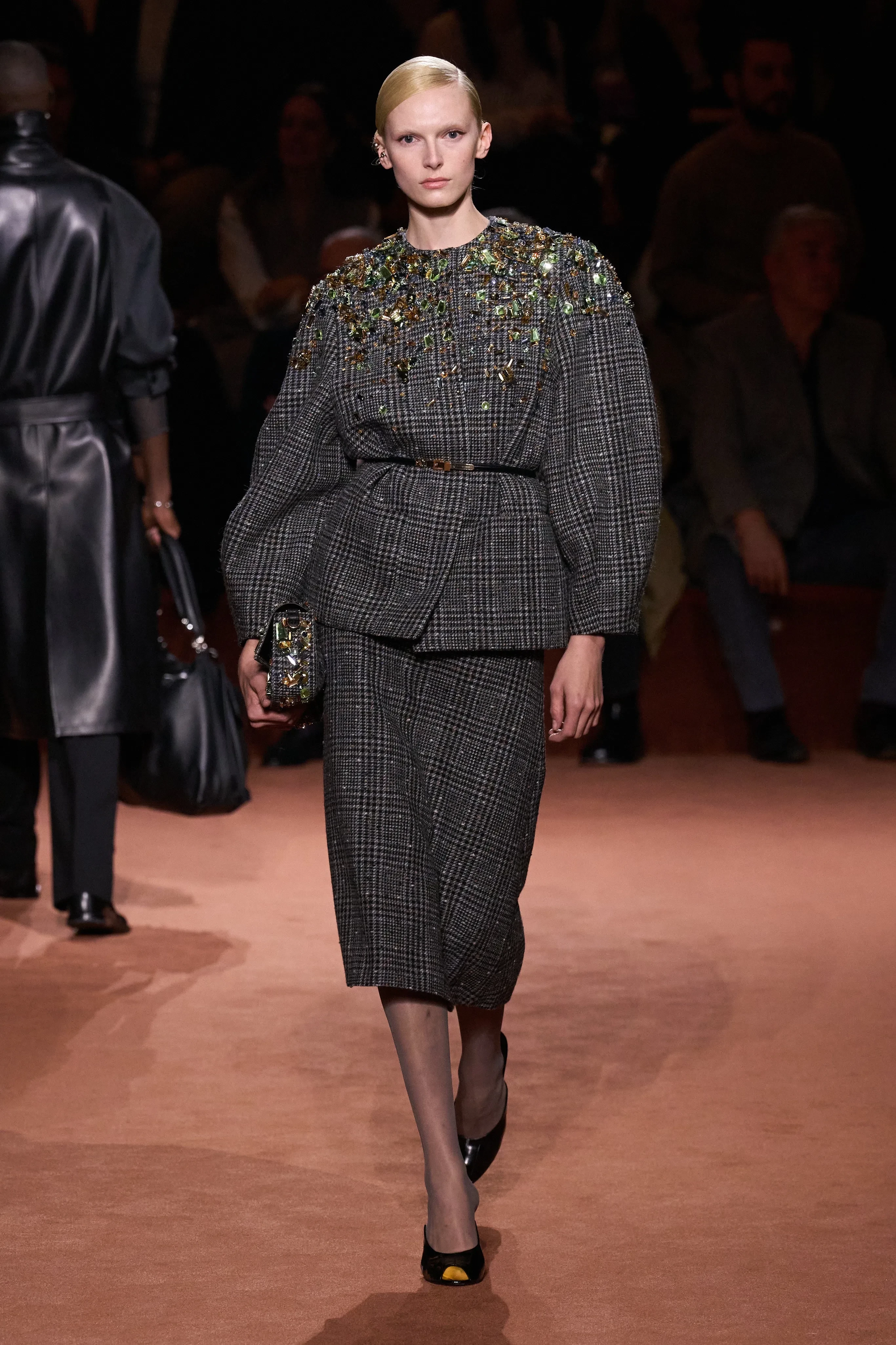Креативный директор модного дома Сильвия Вентурини-Фенди представила коллекцию из 85 луков. Главный акцент она сделала на меховых изделиях и вышивке из драгоценных камней, которыми были расшиты юбки, платья, пальто и обувь. В коллекции также много вещей из кожи, полупрозрачных тканей и "возрастных" силуэтов. Яркой деталью образов стали телесные капроновые колготки с мысами разных оттенков, которые "выглядывали" из туфель.