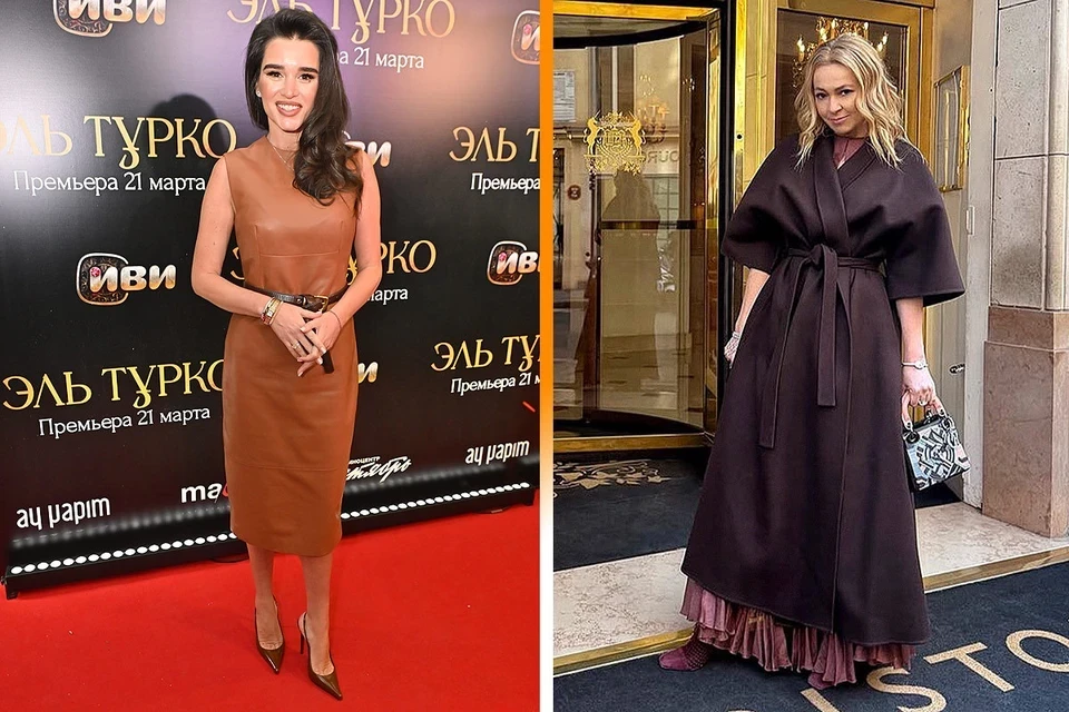 Как носить коричневый цвет: Рудковская сочетает шоколадное кимоно с бордовым нарядом, а Бородина выбирает кожаное платье светло-коричневого оттенка