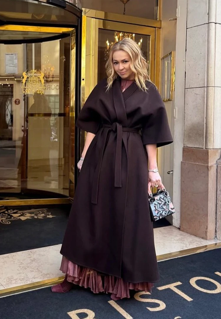 Яна не изменяет себе и стабильно выбирает длину макси. Коричневое пальто-кимоно продюсер сочетает с летящим платьем бордового оттенка. Плюс такого же цвета ботильоны. Продюсер разбавляет образ с помощью акцента — легендарной сумки Lady Dior (одна из любимых моделей Яны).