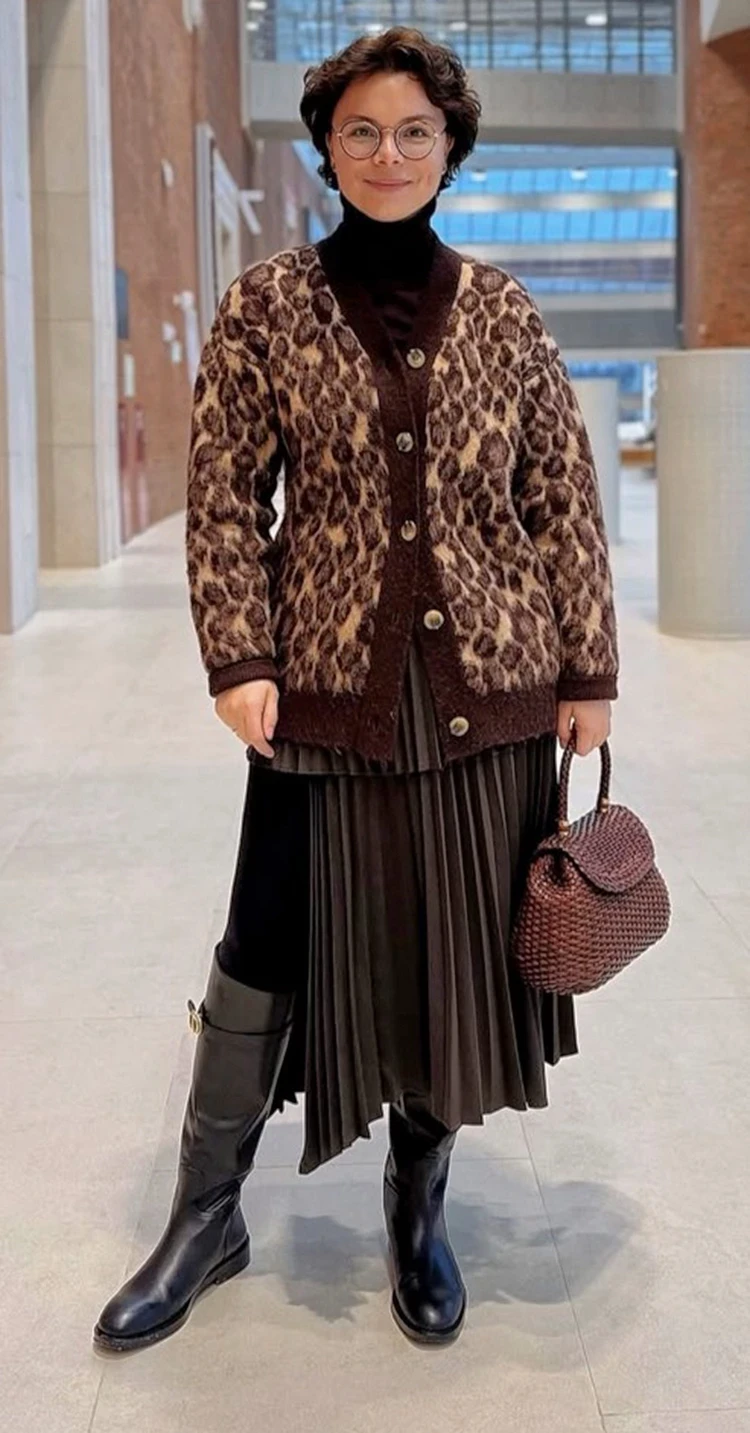 Мне очень нравится коричневая ассиметричная юбка-плиссе у Татьяны. Но вот леопардовый кардиган, который закрывает всю красоту юбки, здесь совсем не в тему. Его нужно снять и оставить одну водолазку. Плюс, добавить крупные золотистые серьги. Так мы получим актуальный интересный образ.