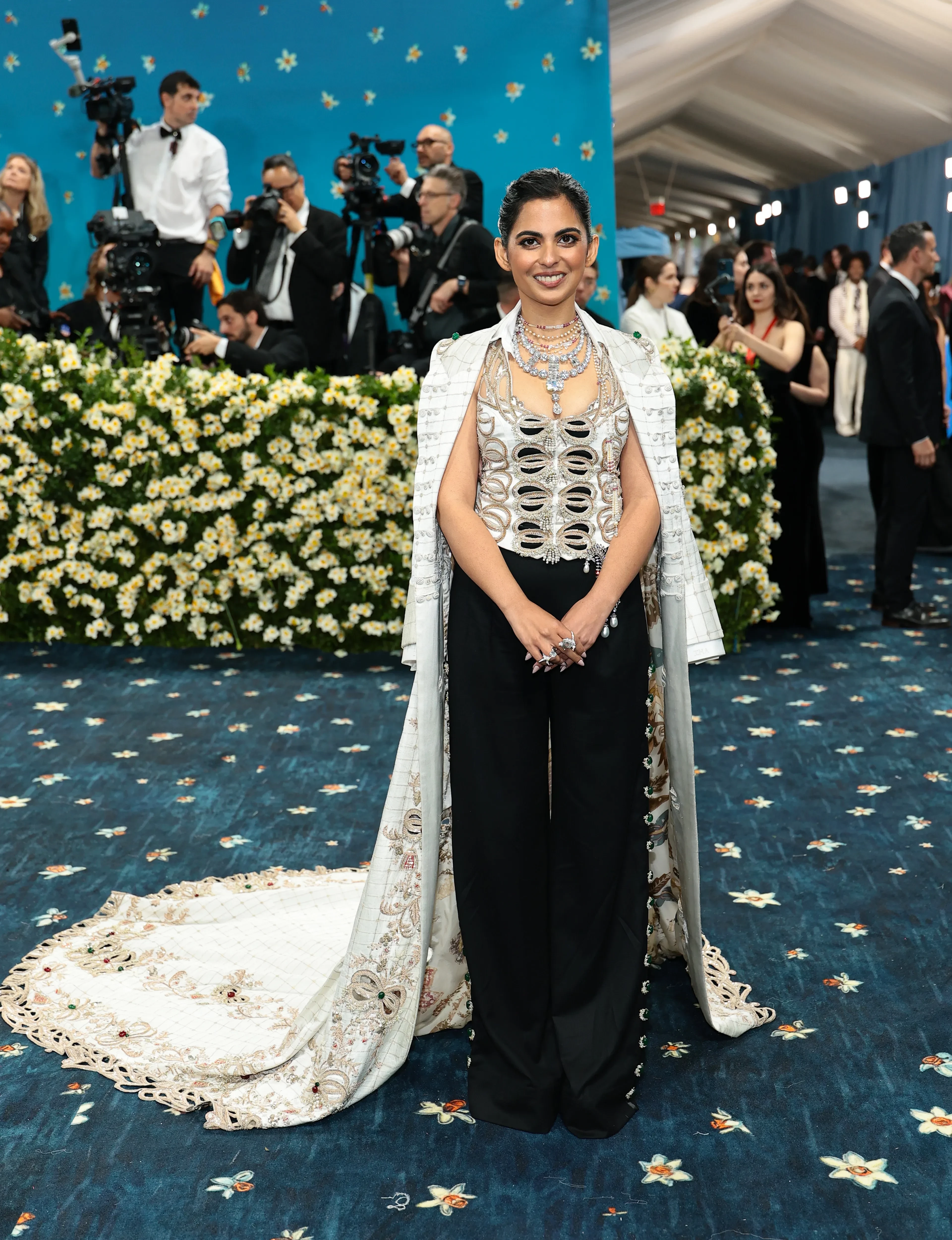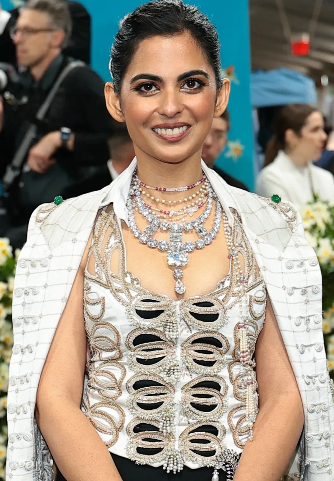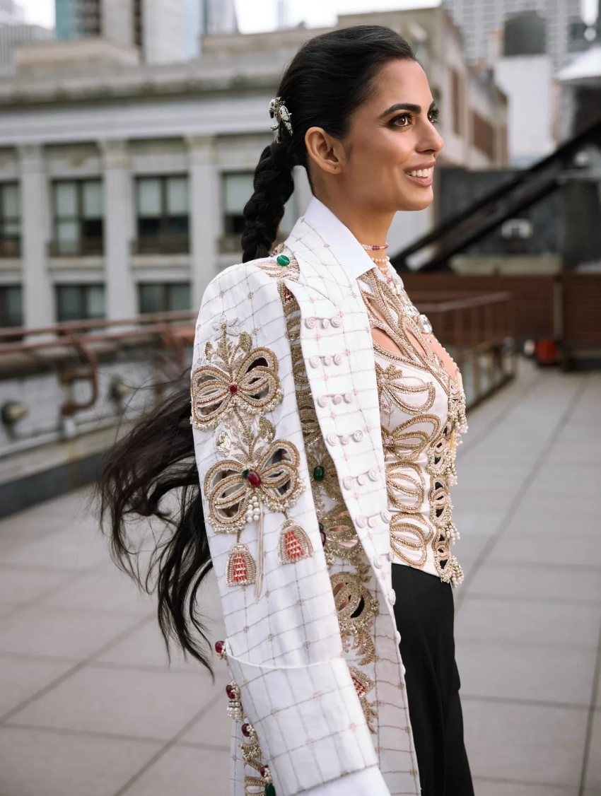 На мероприятии Иша появилась в ожерелье из нескольких бриллиантов: с центральным в 80 карат и меньшими камнями по корпусу. Все бриллианты из хранилища мамы Иши — Ниты. Это украшение копирует самое дорогое колье Cartier, которое принадлежало махарадже Наванагара. Именно его взяли за основу для колье Энн Хэтэуэй в фильме "8 подруг Оушена", только там актриса носила ожерелье из фианитов. При этом, по рассказам дизайнера Анамики Кханны, на весь образ Иши для Met Gala ушло около 15 тысяч часов работы.