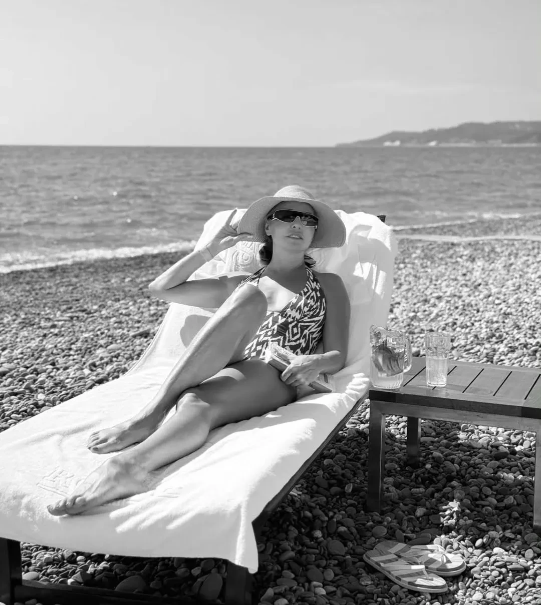 На кадрах можно увидеть, как Татьяна загорает на пляже в купальнике и позирует перед камерой на фоне декоративных растений, украшающих территорию отеля.