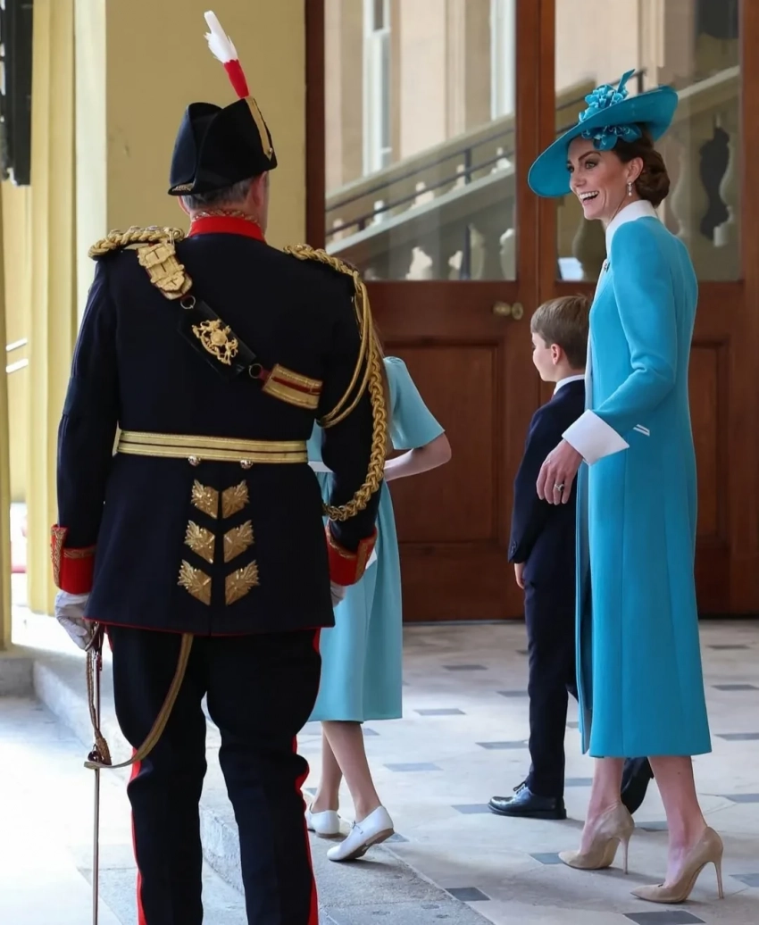 Кейт выбрала для мероприятия нежно-голубое платье-пальто Catherine Walker. Ее образ дополняли широкополая шляпа Juliette Botterill, брошь с изображением полка Ирландской гвардии и серьги с бриллиантами и жемчугом, ранее принадлежавшие королеве Елизавете II.