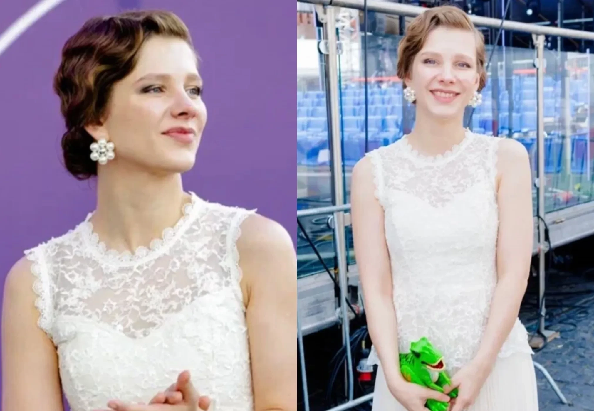 На фото 30-летняя актриса позирует в длинном белом платье с кружевным верхом и плиссированной юбкой. Образ дополняют зелёные туфли и игрушка-динозавр, которую, как рассказала сама Елизавета, вручил ей в качестве талисмана её трёхлетний сын Лев, рожденный от супруга Ильи Авербуха. "Он очень долго выбирал игрушку, которую хотел дать мне с собой в дорогу. Выбрал зелёного динозавра и наказал с ним не расставаться. Так мы с динозавриком в руках и с Лёвой в сердце и провели весь день", — объяснила она в подписи.