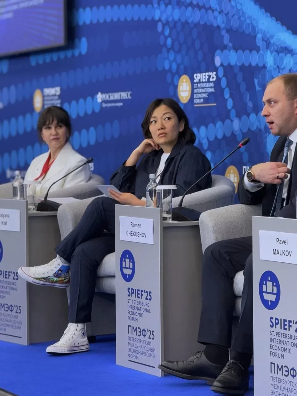 Анастасия Волочкова, Мария Янковская ("Сигма-бой") и Татьяна Ким в необычных кедах приняли участие в ПМЭФ-2025