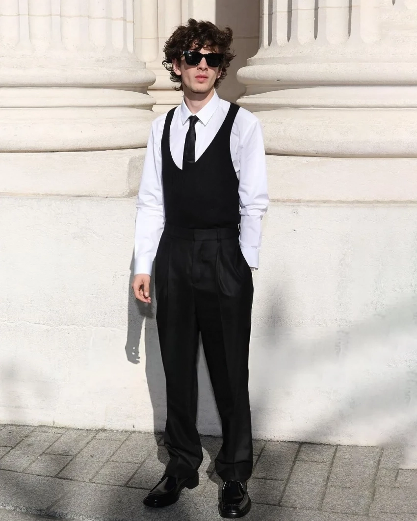 Марк Эйдельштейн посетил показ мужской коллекции Saint Laurent в Париже. Перед фотографами завсегдатай модных мероприятий позировал в наряде от бренда: на нём была белая рубашка и чёрный костюм, состоящий из трикотажного жилета и классических брюк. Образ Марк дополнил галстуком в тон и солнцезащитными очками.