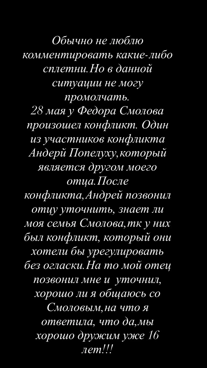 Сторис Дарьи ВалитовойСторис Дарьи ВалитовойВалитова подчеркнула, что после этой встречи её отец больше не контактировал со Смоловым. "Мне больно и неприятно, что после стольких лет дружбы и искренних побуждений помочь своему другу всё вот так происходит", — написала она. Дарья также добавила, что пыталась повторно связаться с Фёдором, но тот не ответил на звонок, а позже прислал сообщение: "Это не я, это мои адвокаты". По её мнению, за реакцией спортсмена стоит влияние его юристов и PR-команды. "Понимаю, что его адвокаты, пиарщики и прочие люди, которые ему помогают, не могут обойтись без фамилии Кокорин. Но всё же это некрасиво! Я думаю, что его реакция на мой звонок тому доказательство", — резюмировала она.