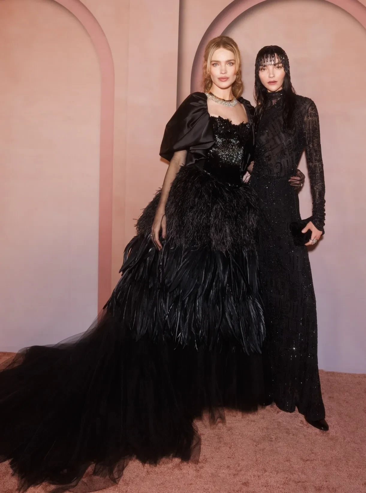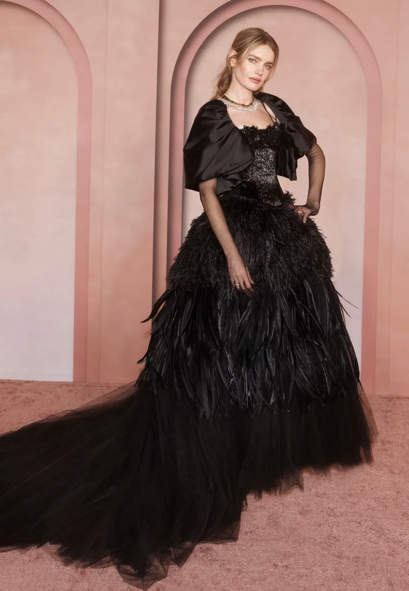 43-летняя супермодель вышла на дорожку в чёрном платье Dolce & Gabbana Alta-Moda с корсетом и объёмной юбкой с перьями из коллекции 2025 года. На создание образа стилиста Натальи Хьюго Тукаса Терзияна вдохновила героиня Натали Портман из фильма "Чёрный лебедь".