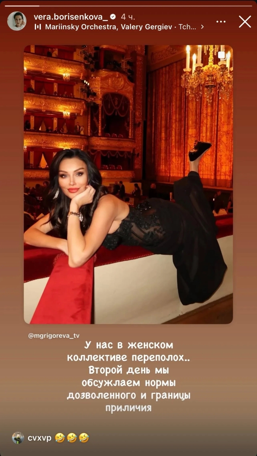 Сторис* Веры БорисенковойСтоит отметить, что Большой театр уже давно приобрёл сомнительную репутацию как одно из самых "инстаграмных" мест, особенно любимых селебрити и светскими львицами. Так, например, из-за ежегодного наплыва звёзд на зимние показы балета "Щелкунчик" стоимость билетов стала отдельной темой для скандалов и бурных дискуссий.