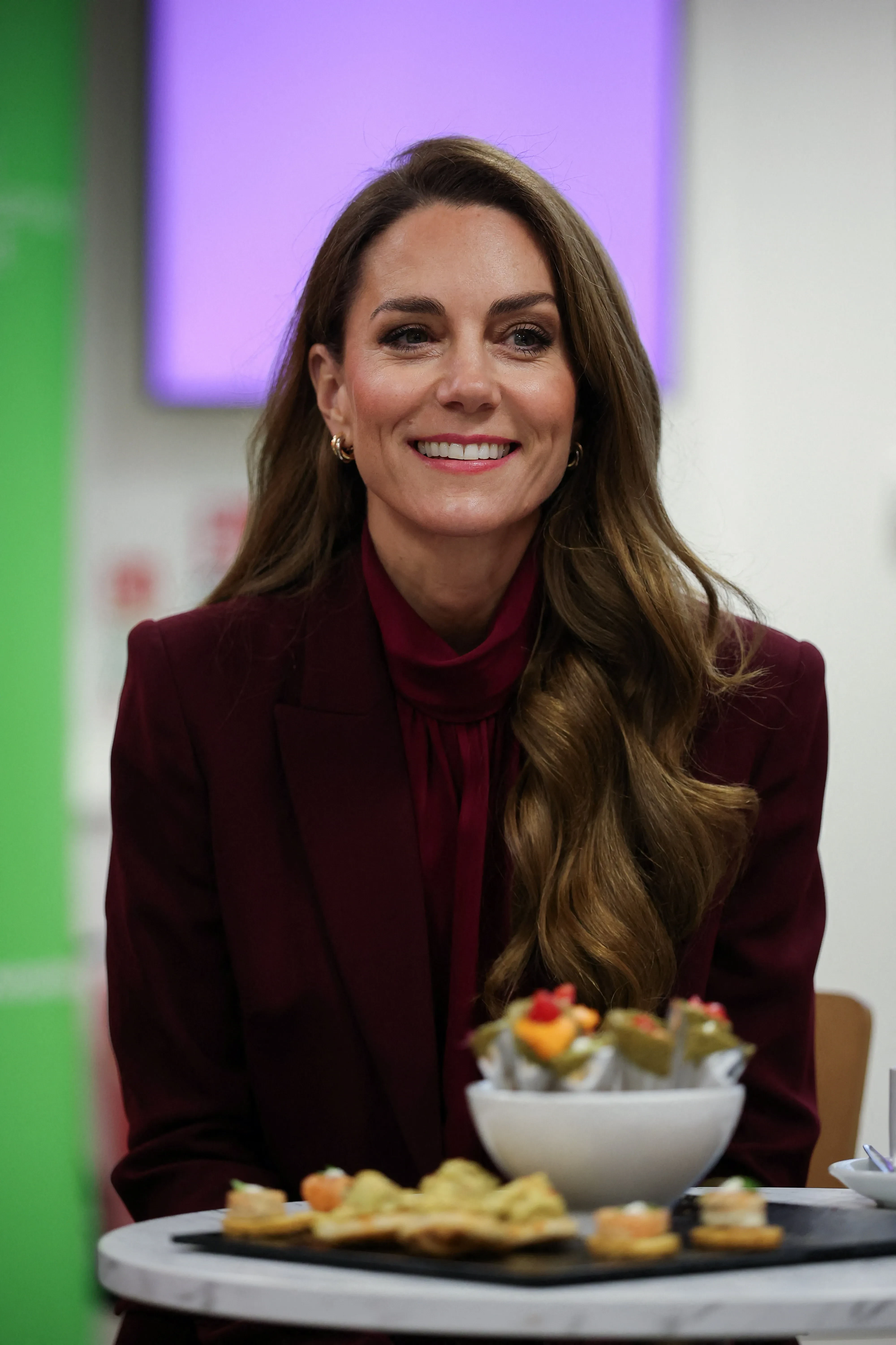 44-летняя принцесса Уэльская появилась на публике в бордовом брючном костюме и туфлях в тон, а 43-летний принц надел рубашку с галстуком, свитер, пиджак и замшевые ботинки. Супруги встретились в больнице с медицинским персоналом и отметили работу Национальной службы здравоохранения в напряжённый зимний период.
