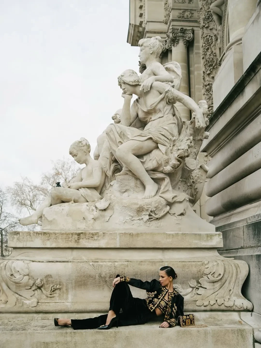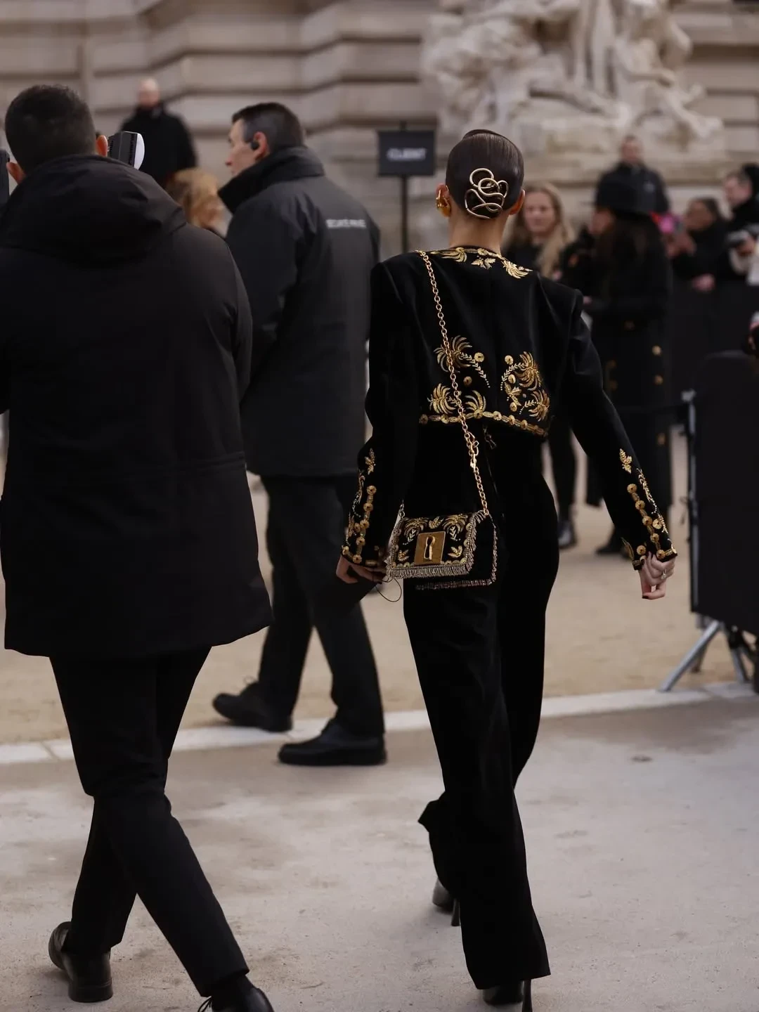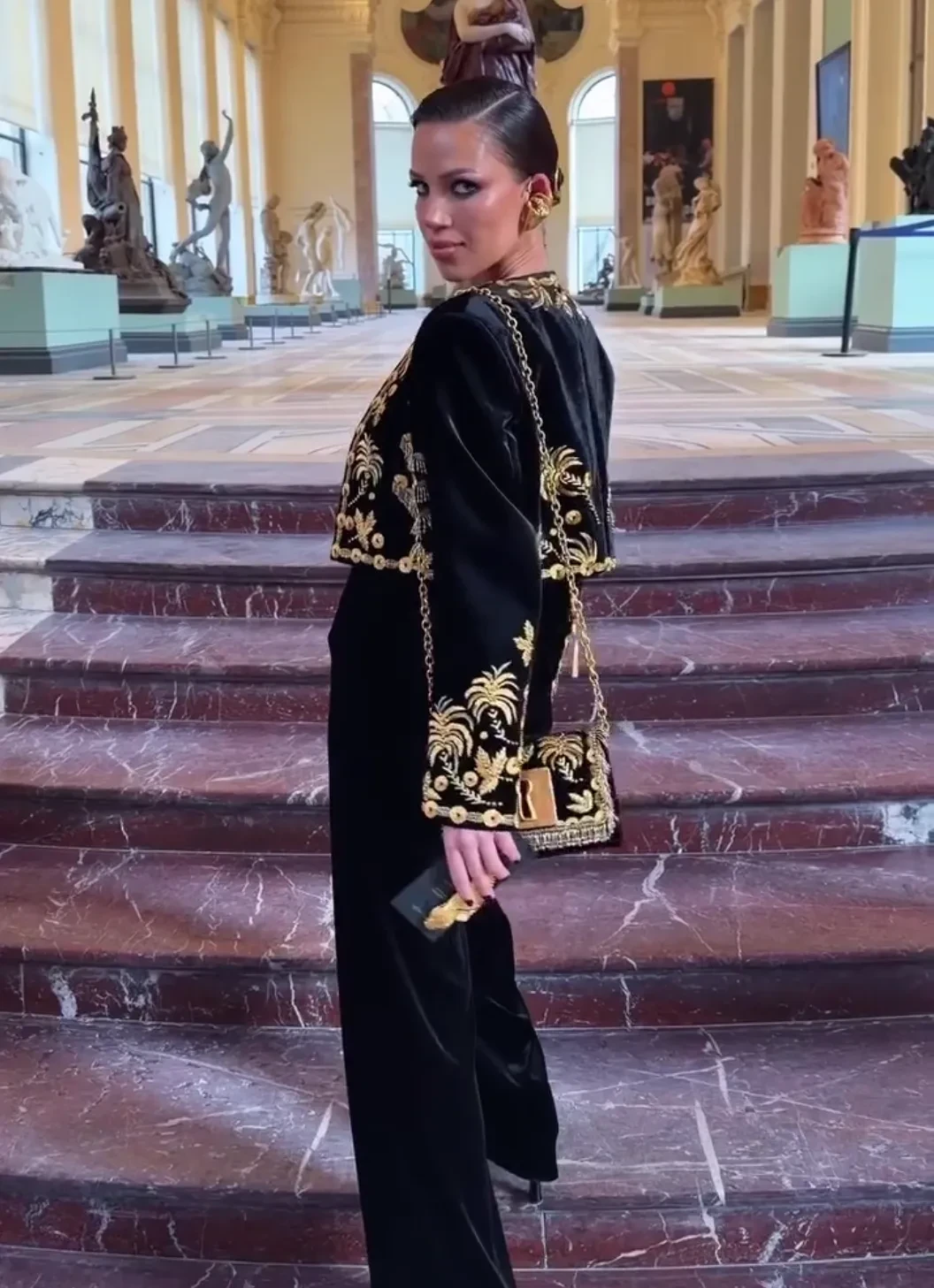 31-летняя Шевчук пришла на шоу в тотал-луке Schiaparelli: она надела брючный костюм из чёрного бархата с золотой вышивкой. Образ дополнили сумка в тон и золотая моносерьга. Жена бизнесмена прошла за кулисы после показа, где сфотографировалась с моделями и поправила макияж у легендарной визажистки Пэт Макграт.
