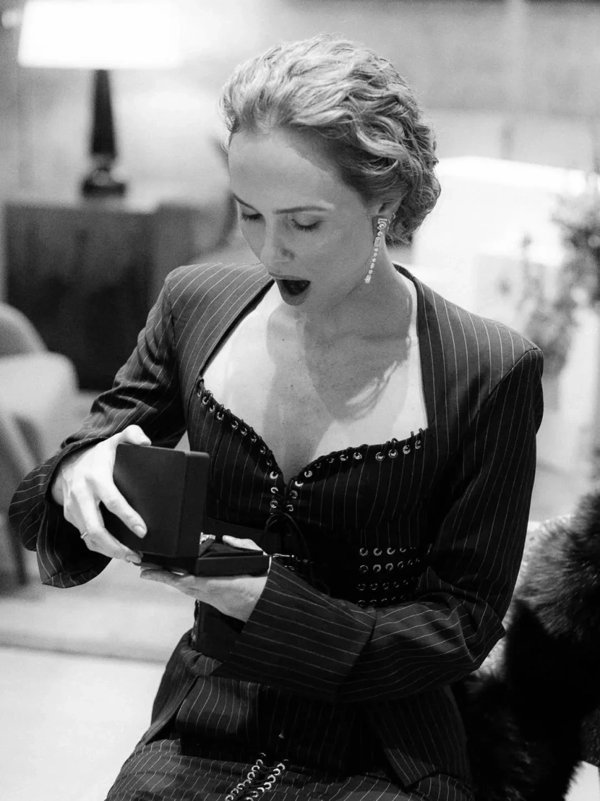 Ольга Карпуть рассказала в соцсетях, что её день рождения начался с праздничного завтрака от мужа: "блинчики с йогуртовой намазкой, лососем и чёрной икрой" и шампанского. После этого 62-летний бизнесмен Павел Тё предложил супруге выбрать в подарок украшения Chanel. "Не идти же на показ "голой", — пояснила Карпуть.