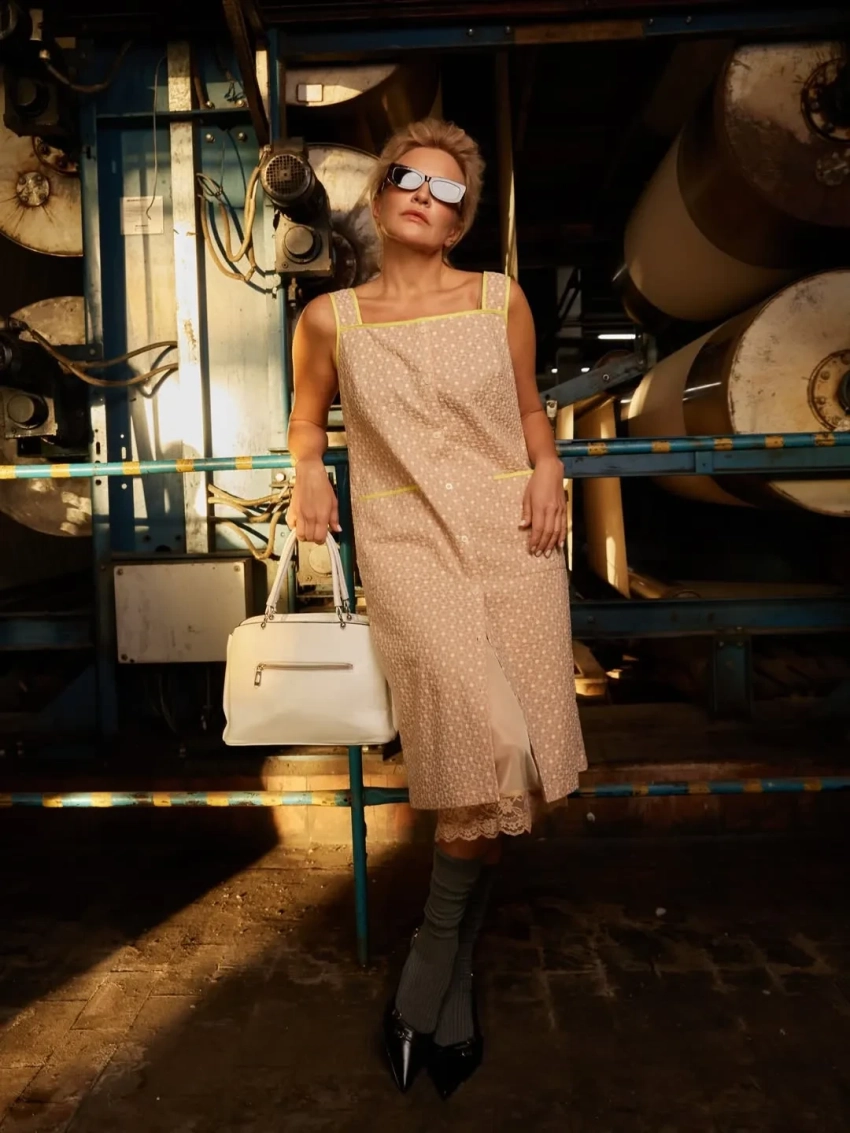 Шелягова примерила фартуки, платья и сарафаны с уникальными принтами, которые были специально отобраны и воссозданы художниками Шуйской фабрики по архивным образцам XVIII—XIX веков и перенесены на современный ситец.