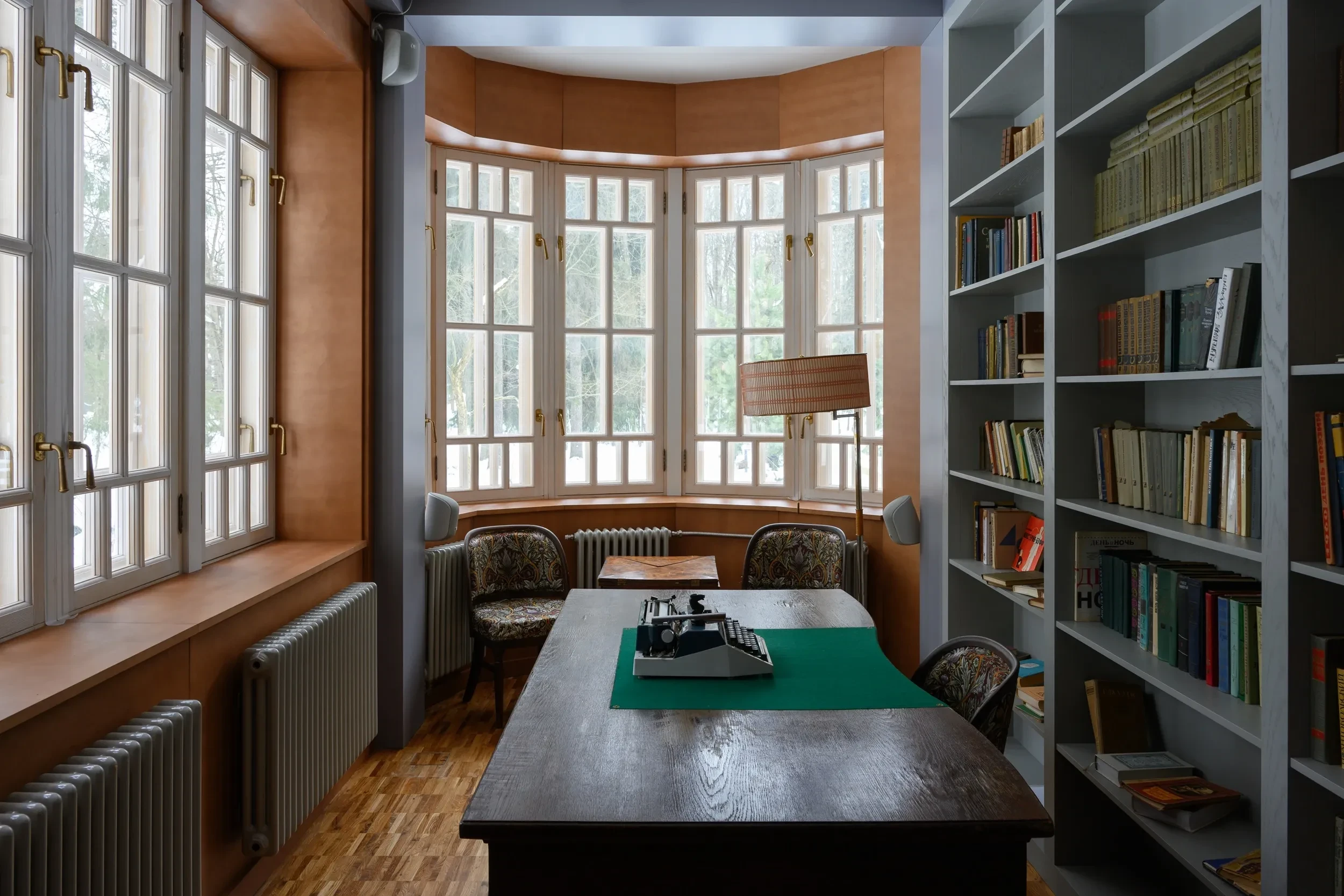В конце 90-х годов здание сильно пострадало от частных съёмщиков и находилось в аварийном состоянии. Чтобы сохранить его, необходимо было фактически подвесить дом в воздухе, залить под него фундамент и укрепить конструктив внутренним каркасом из бруса. Для центрального зала художник Алексей Лука создал инсталляцию "Писательские столы" — они стали центральным арт-объектом и местом для экспонирования архивных документов выставок.