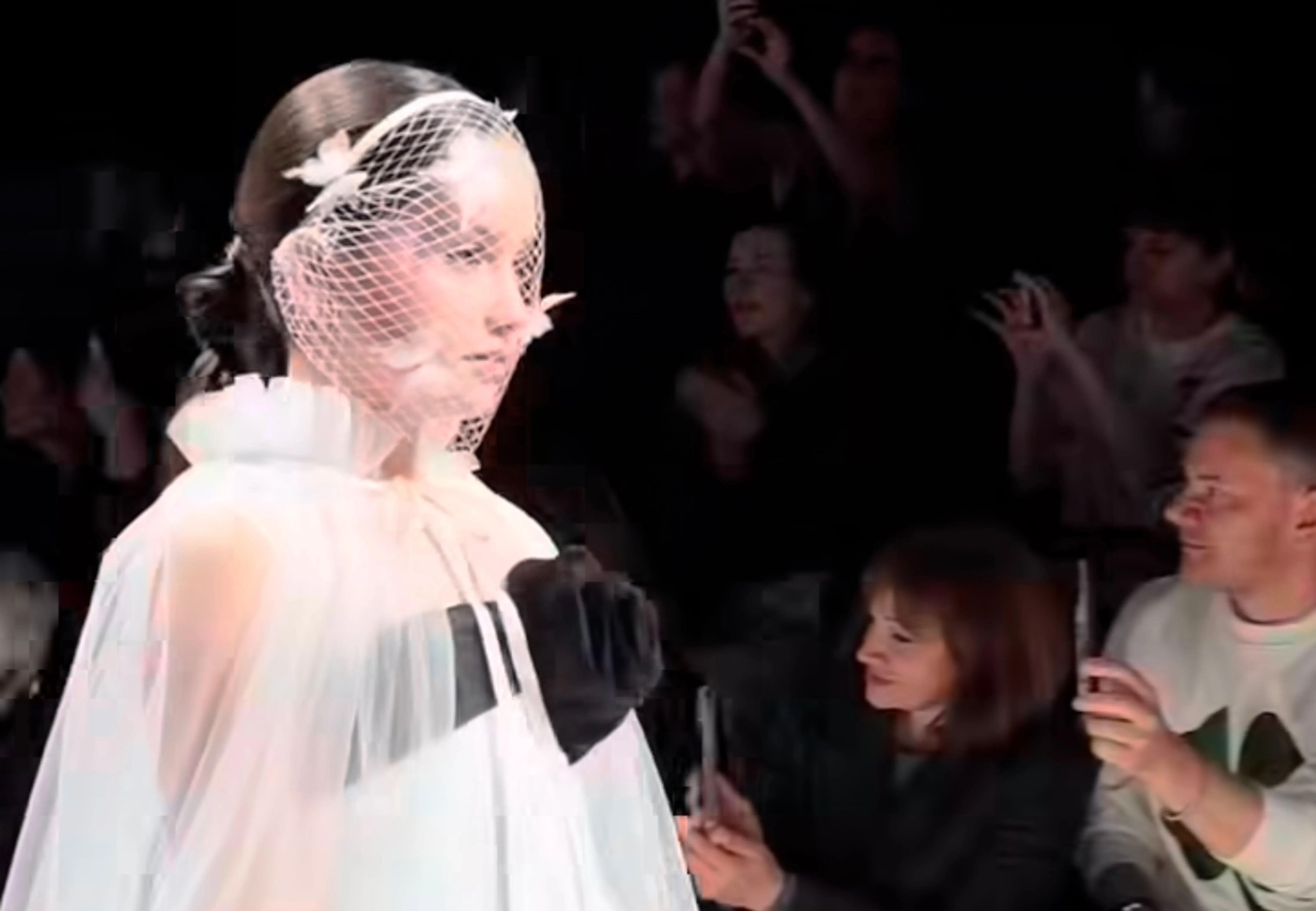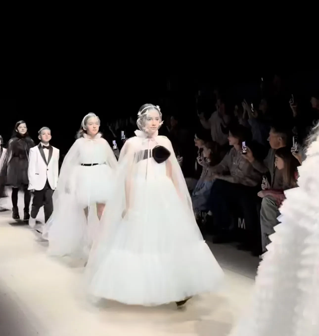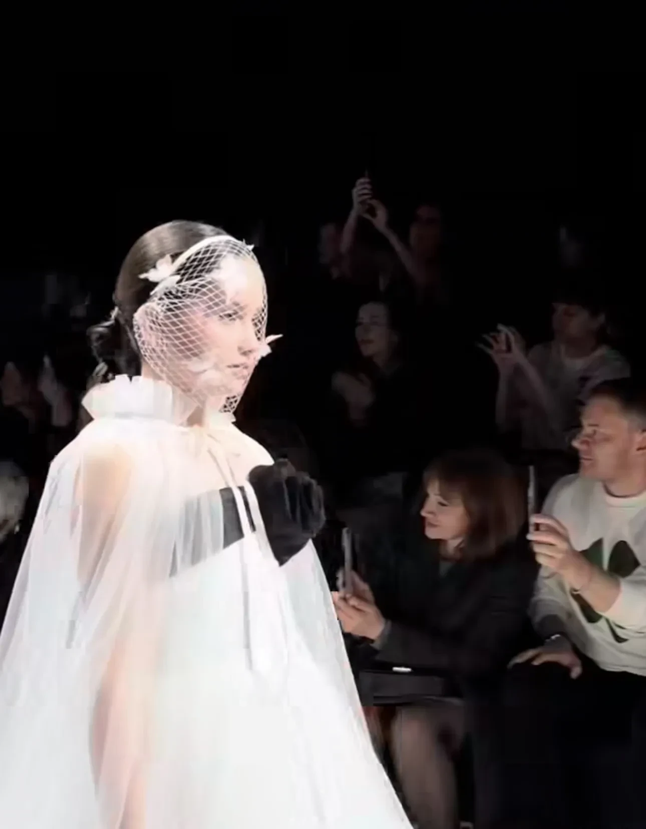 Мия ПрилучнаяМия продефилировала в пышном белом платье с акцентной черной лентой, украшающей лиф. Поверх плеч была надета прозрачная накидка в пол, а лицо обрамляла вуаль в белую сетку с бабочками.