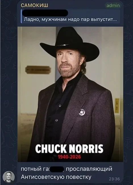 "Сдох чак норрис. Чо, скорбим, ДБ?" — говорится в публикации, опубликованной от имени Самокиша (орфография и пунктуация автора здесь и далее сохранены. — Прим. ред.).