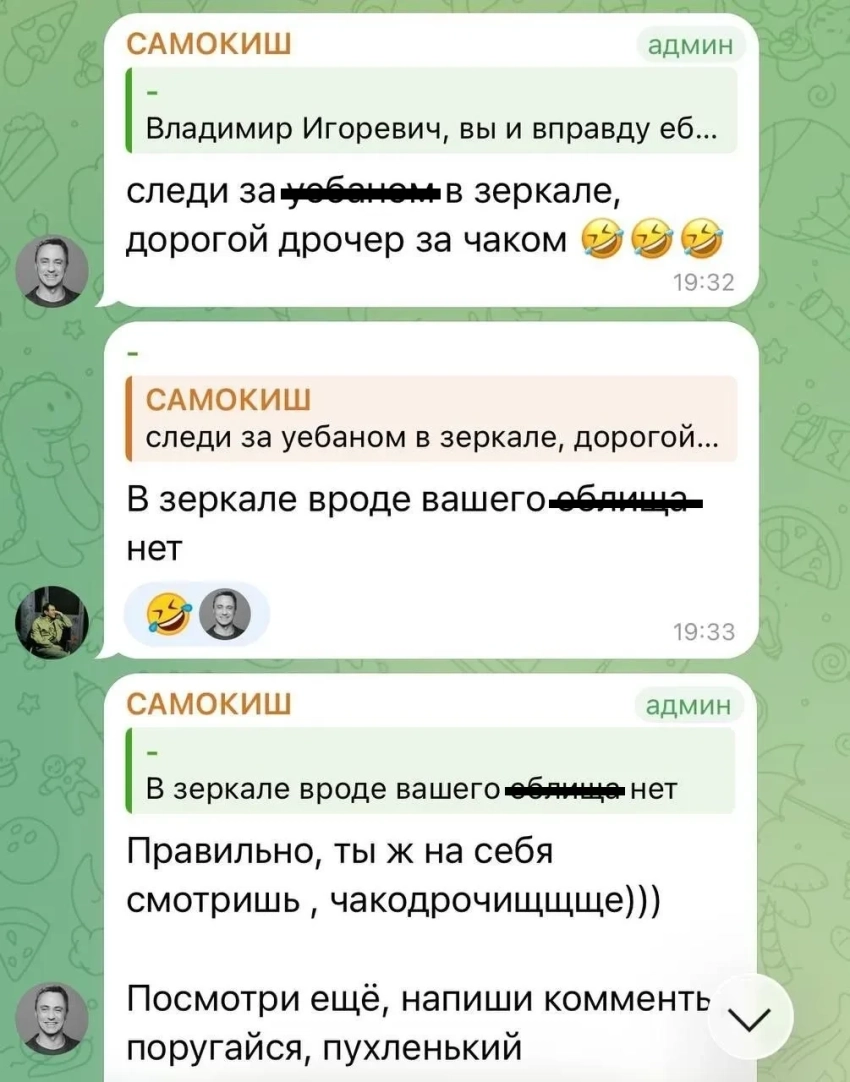 Пост в телеграм-канале Владимира СамокишаЭтого оказалось недостаточно, и в комментариях чиновник также назвал актёра "потным ******** (дураком), прославляющим Антисоветскую повестку". Ожидаемо, реакция общественности не заставила себя ждать: шокированные пользователи стали массово критиковать Самокиша, упрекая того в бестактности и призывая объясниться за свои слова. Однако в ответ от лица депутата на людей обрушился шквал ненормативной лексики и оскорблений. В частности, он назвал комментаторов "дрочерами", "ссыкливыми поклонниками америкосовских ногомахателей" и вызывал их "раз на раз".