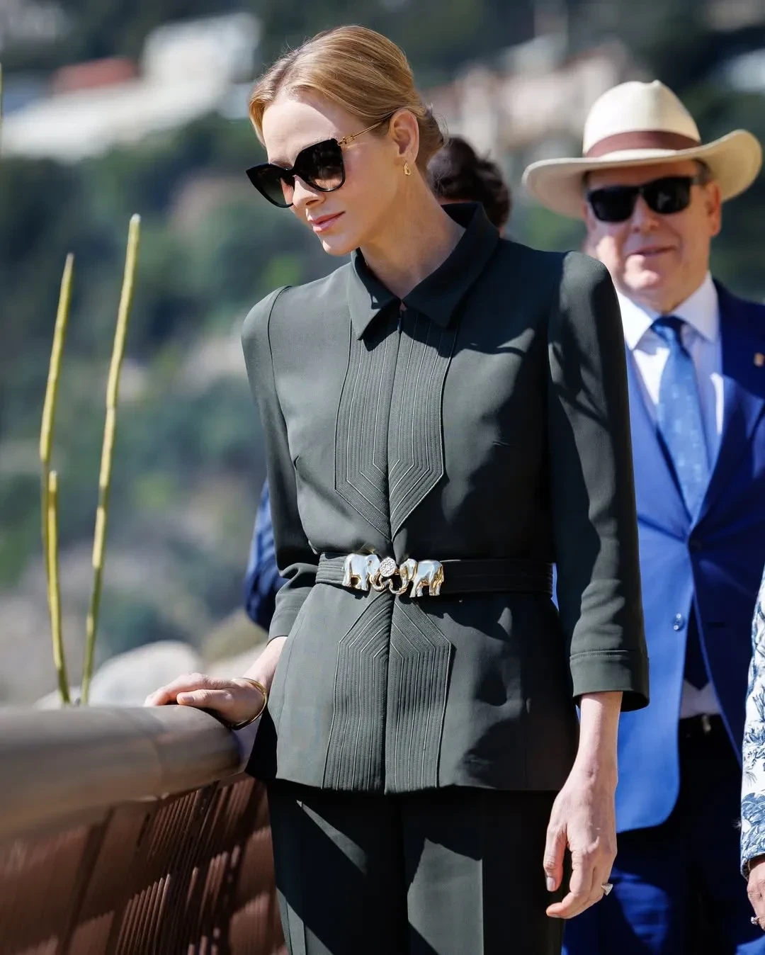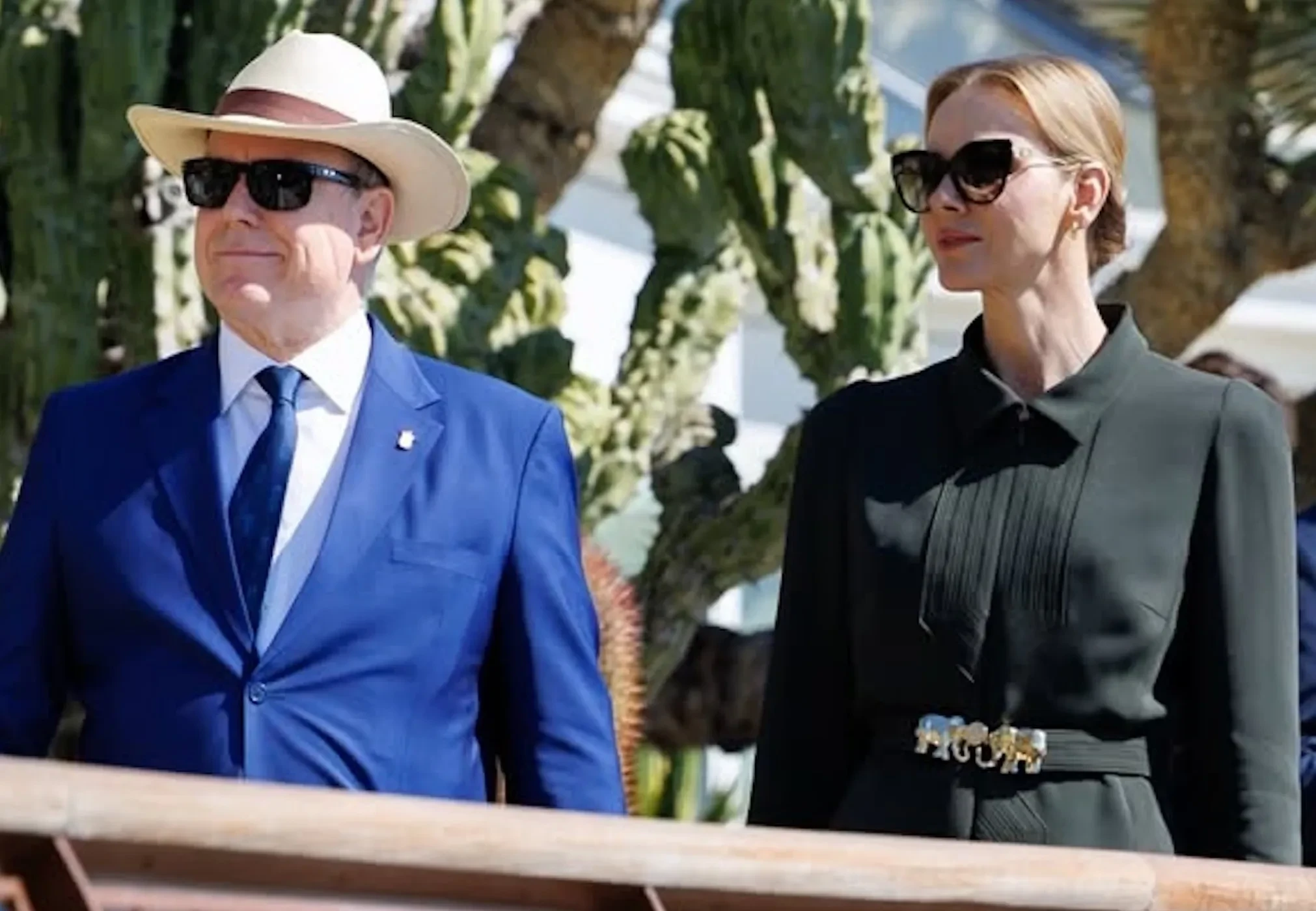 48-летняя княгиня Шарлен появилась на публике в тёмно-зелёном брючном костюме Elie Saab и туфлях на каблуках. Образ дополнили солнцезащитные очки и золотые серьги. 68-летний князь Альбер II был одет в синий костюм с галстуком, солнцезащитные очки и шляпу.
