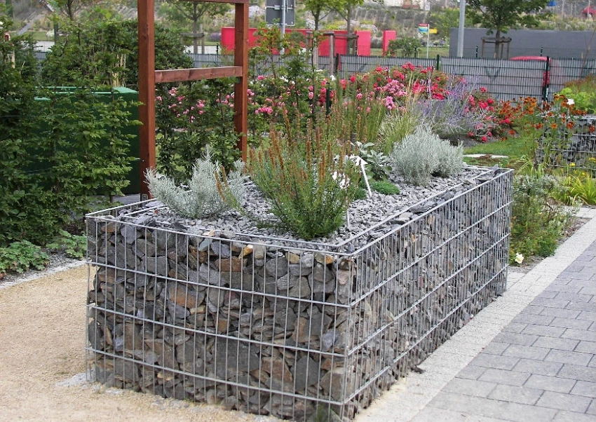 Декоративный каркас из сетки, заполненный камнями. Он служит как подпорка, так и элемент клумбы. После укладки камней внутри сетки сверху насыпается почва и высаживаются растения.