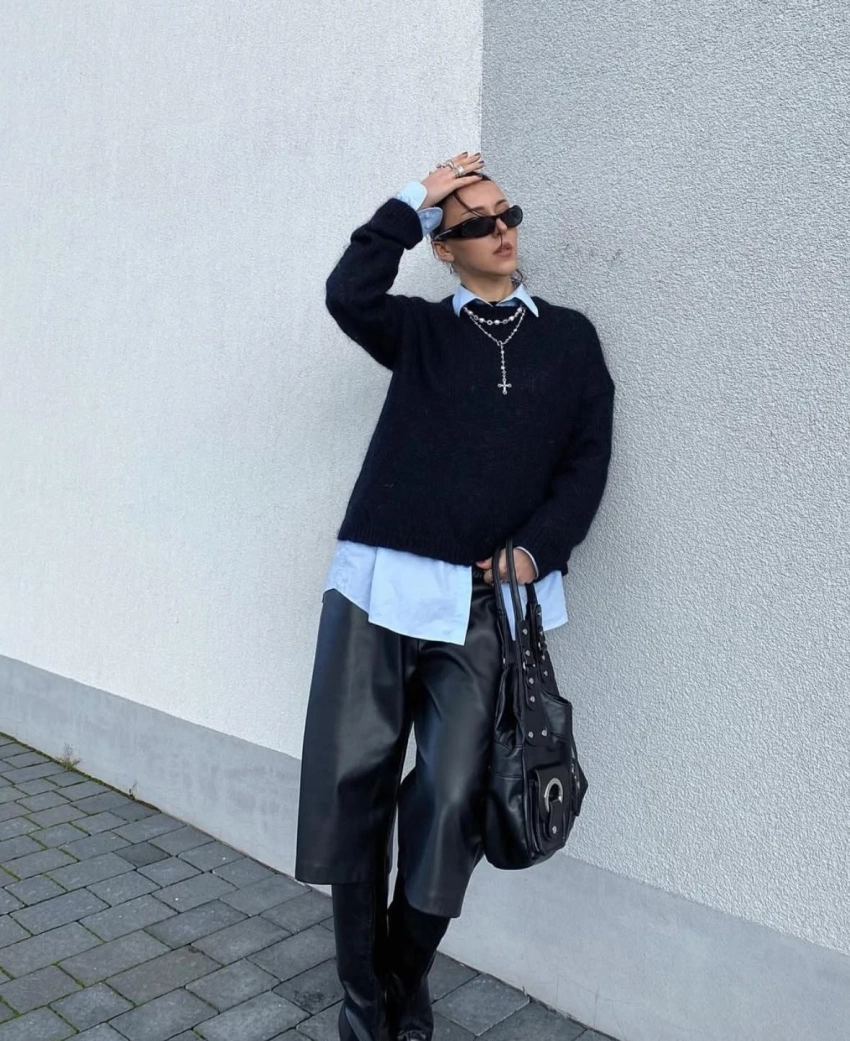 Кожаные ботфорты на устойчивом каблуке отлично балансируют объем брюк, а гетры или носки в тон добавляют трендовую многослойность. Такой образ легко адаптировать под кэжуал с худи или сделать более строгим, добавив жакет.