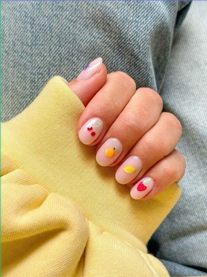 На нескольких ногтях можно изобразить миниатюрные клубники, вишни или абстрактные ягодки в красных и розовых оттенках с аккуратными зелеными хвостиками. Остальные ногти оставляют однотонными, благодаря чему маникюр выглядит легким и свежим.