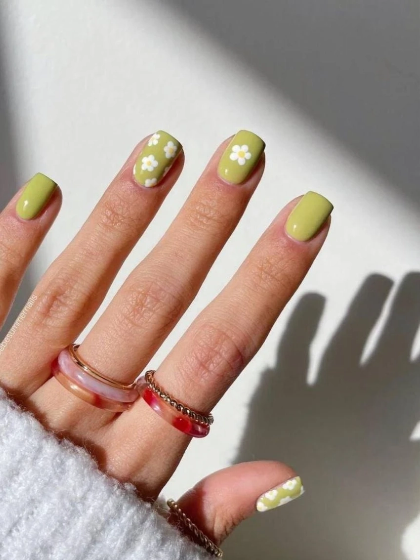 Зеленый маникюр с мини-цветами