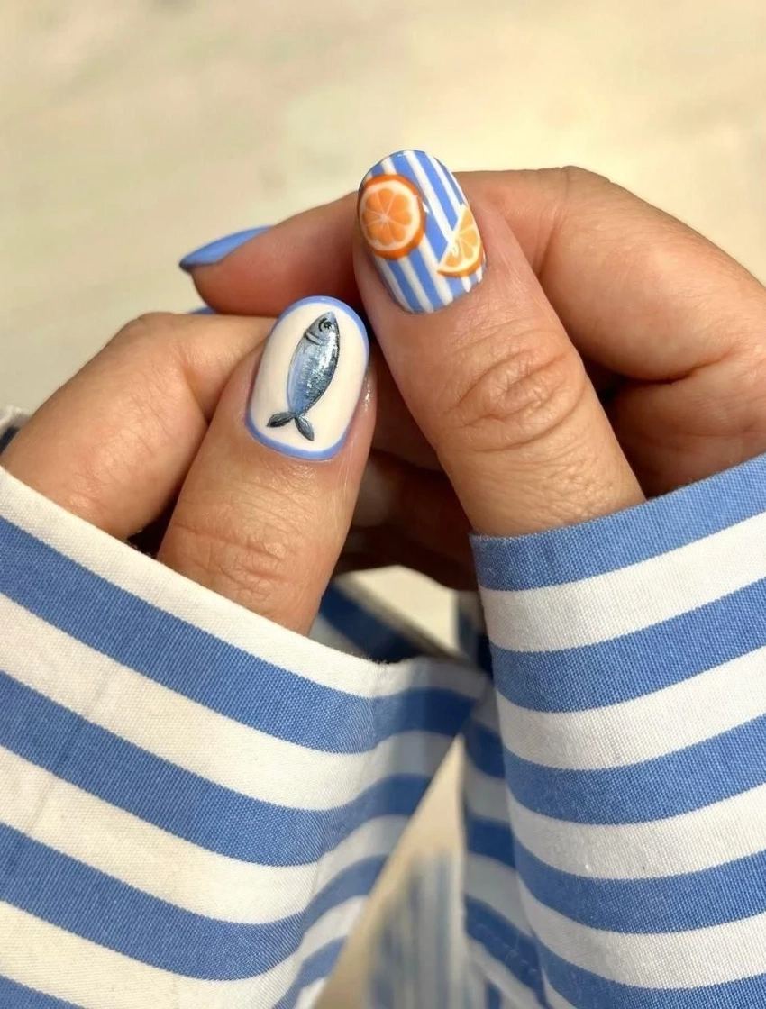 Морской маникюр с полосками и рыбками
