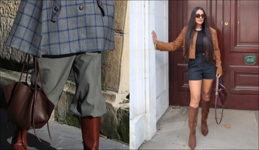 Один из самых удобных трендов сезона. Брюки, заправленные в высокие сапоги, выглядят современно и защищают от переменчивой весенней погоды.
