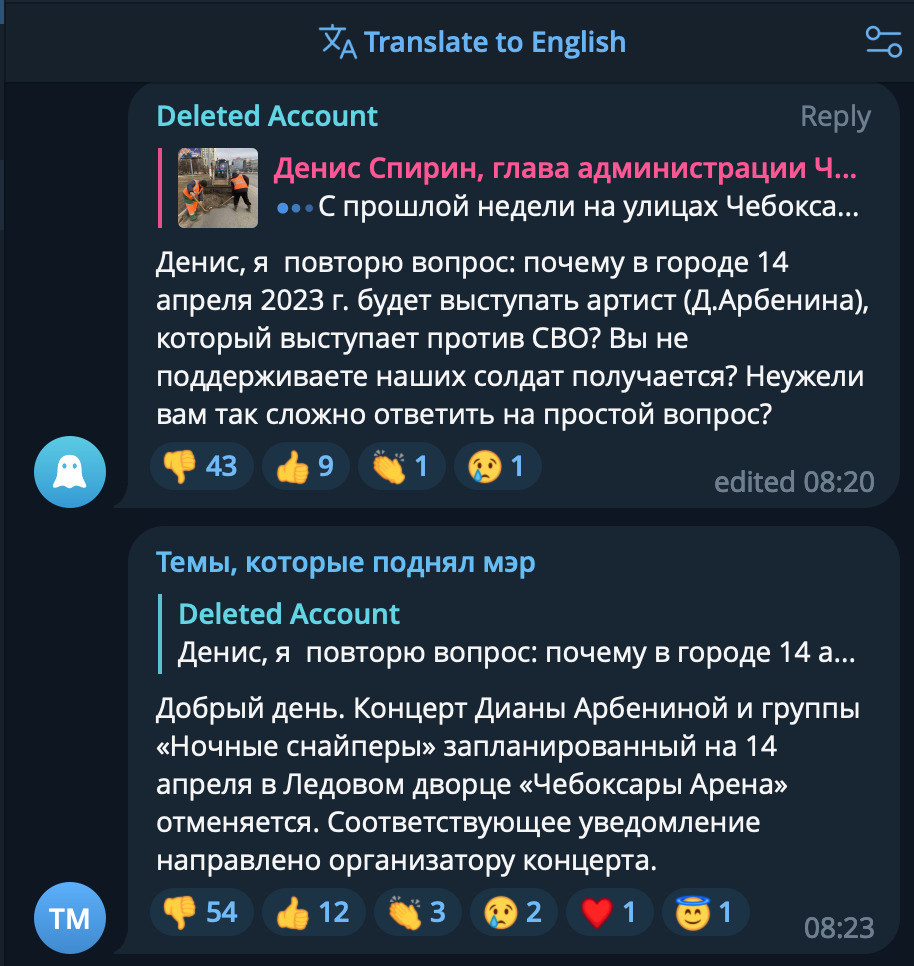 При этом в Чебоксарах сначала в чате телеграм-канала главы города Дениса Спирина появилось сообщение пользователя с вопросом: «Почему в городе будет выступать артист, который выступает против СВО?» А уже в ответе на него рассказали, что концерт отменен, — выяснили журналисты pronedra.ru.