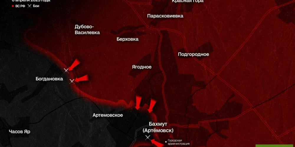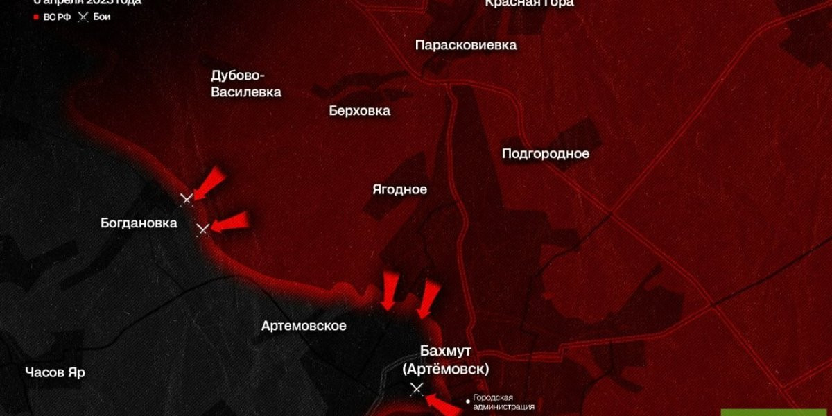 К западу от Артемовска ЧВК «Вагнер» подошли к Богдановке и готовятся к штурму. В случае успеха российские части могут выйти непосредственно к Часов Яру и окончательно прервать сообщение с Артемовском. Последние новости о ходе военной спецоперации на Украине на сегодня, 7 апреля 2023 года, новая карта боевых действий на Украине в материале «Интересной России».