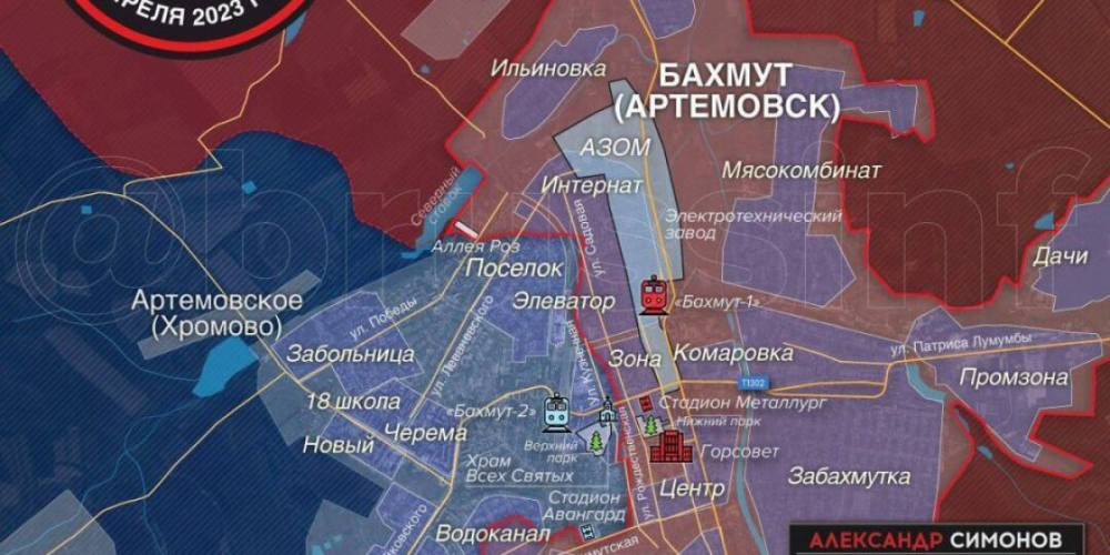 ЧВК «Вагнер» взяли стадион Металлург и подошли к улице Кузнечной. Передовые позиции «музыкантов» находятся в районе Верхнего парка. Железнодорожная станция и Храм всех святых пока еще под контролем врага.