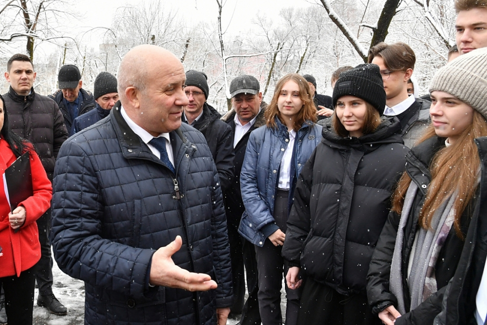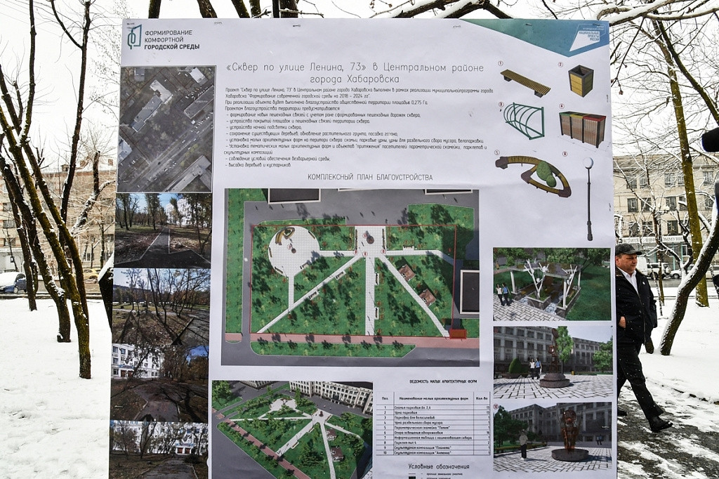 Во время презентации мэр также рассказал учащимся и местным жителям, что по периметру общественной территории будут высажены молодые деревья. В свою очередь учащиеся Хабаровского института инфокоммуникаций предложили главе города название для новой зоны отдыха — сквер “Связь поколений”.