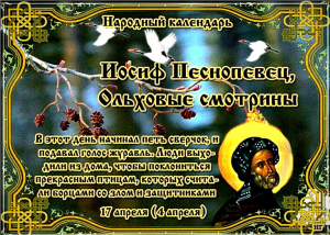 В народном календаре 17 апреля прозвали Ольховыми смотринами. В православном мире этот день тесно связан с преподобным Иосифом Песнопевцем. Именно в данный период начинали активно пробуждаться от зимы сверчки. Существовали особые обряды, традиции и приметы на этот день.